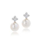 Genuine 8mm White Pearl Earrings and Moissanite Magnolia for Women in 18K White Gold over Silver