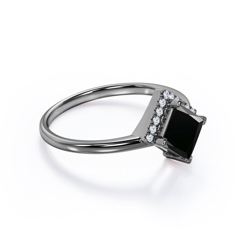 The wait is over for those women who are tired of those crazy details which is not necessary for your engagement ring, this minimal black diamond ring is the best for you. All of our rings are genuine, real and authentic. Perfect for valentine, mother's day, anniversary gift and at a very reasonable prices. This black diamond ring features an approximately 1 carat princess cut lab created black diamond, surrounded by .15 carat authentic side diamonds, for a total weight of 1.15 carats.
