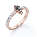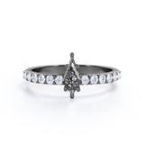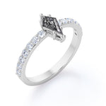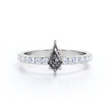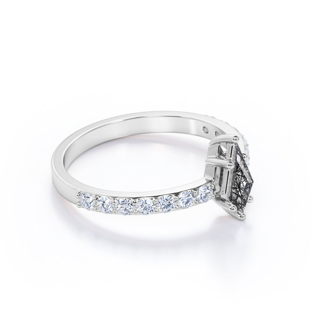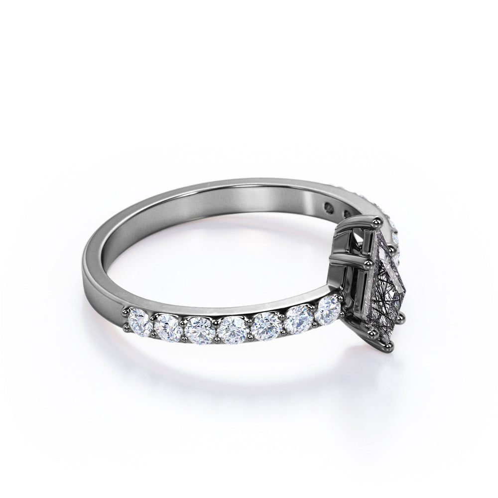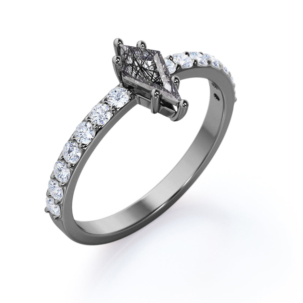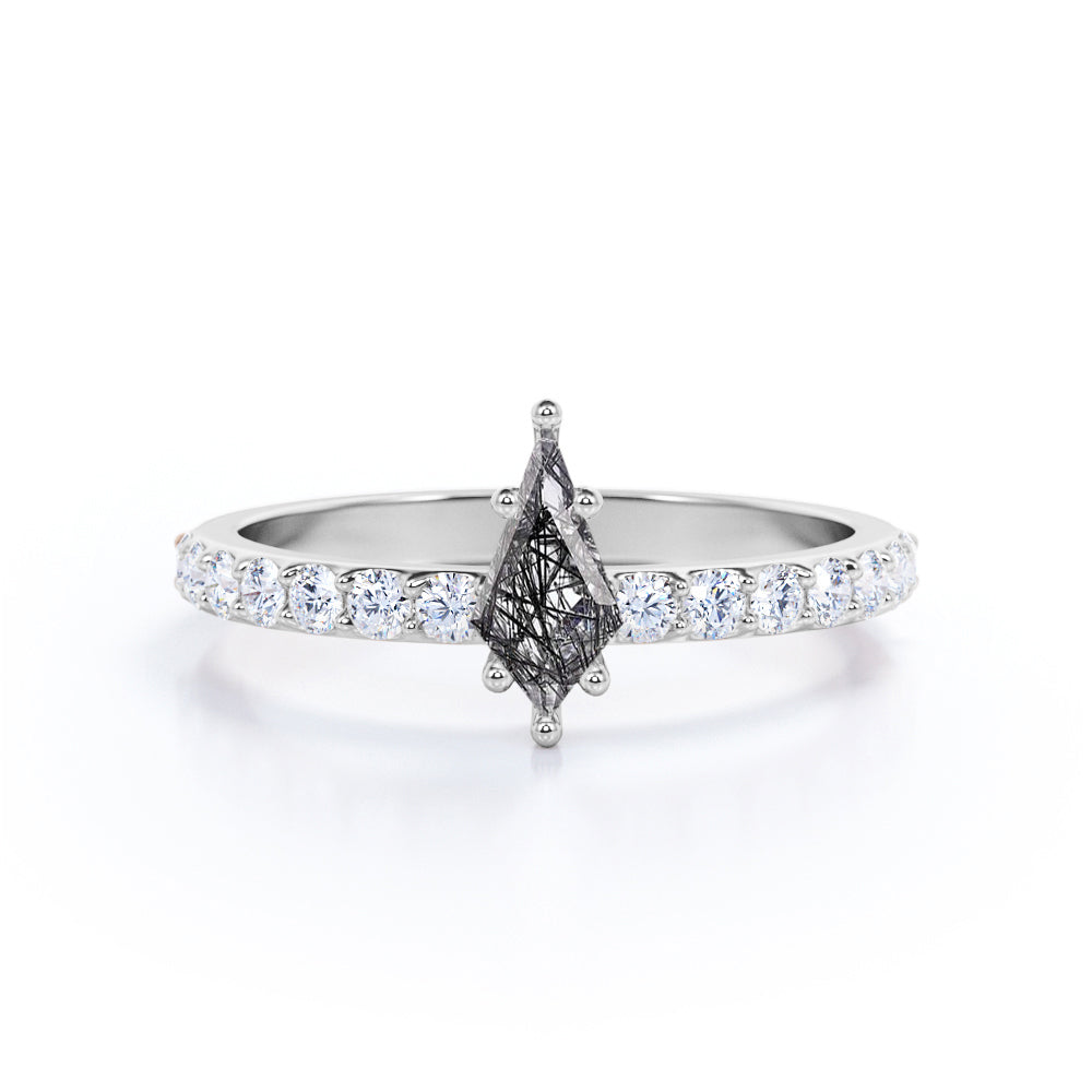Geometric 1.25 carat Kite Shaped Precious Black Rutilated Quartz And Diamond Six Prong Half Eternity Engagement Ring In White Gold. Glistening and glamorous, this natural black rutilated quartz ring will win your heart. This exquisite design features a kite shaped center stone and 0.25 carat shimmering round white diamonds sparkles around the half eternity band of this splendid engagement ring. The white diamonds set in a white gold band exhibits amazing brilliance and unbelievable sparkle making this ring vivid and dramatic. This six prong black rutilated quartz and diamond engagement ring shimmers with all your beautiful moments to come. Simply gorgeous, modern and understated, this is the perfect engagement ring for a woman who wants something modern and beautiful. Handmade with utmost love and detailed attention, this geometric 1.25 carat kite shaped black rutilated quartz and diamond six prong half eternity engagement ring in white gold can also be customized into 18k Gold plating over silver, 10k Gold or 14k Gold as per your desired choice.
