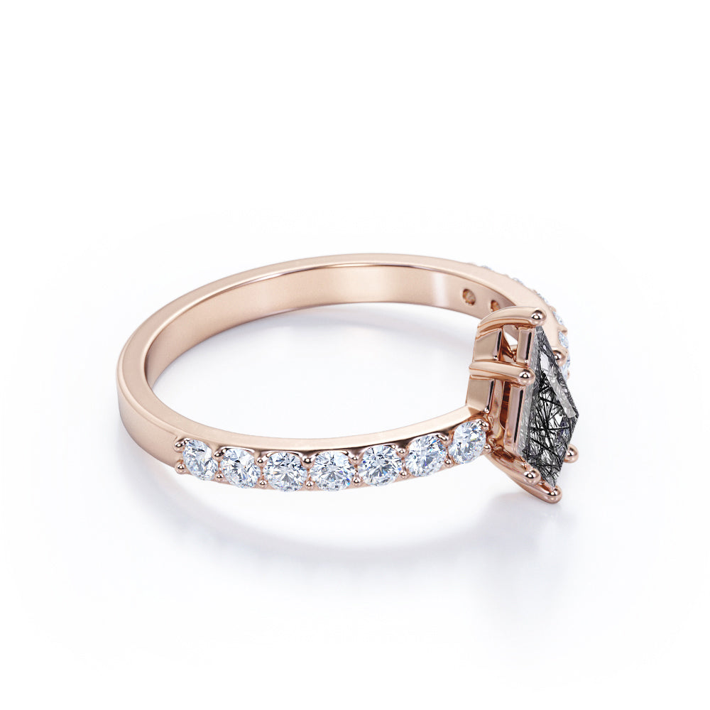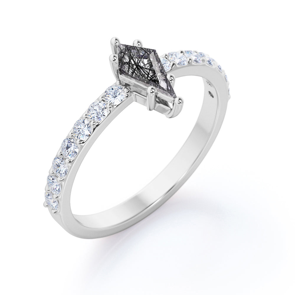 Geometric 1.25 carat Kite Shaped Black Rutilated Quartz And Diamond Six Prong Half Eternity Engagement Ring In White Gold
