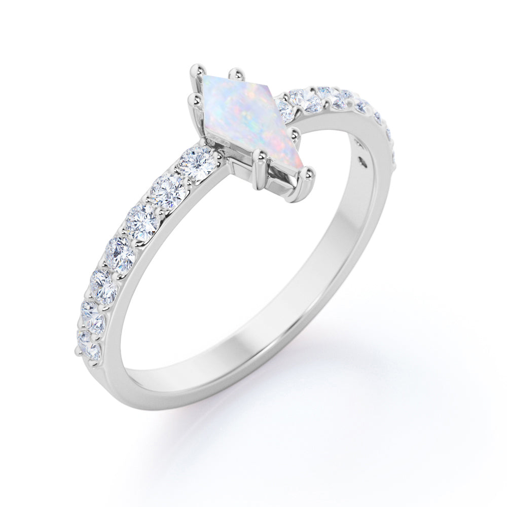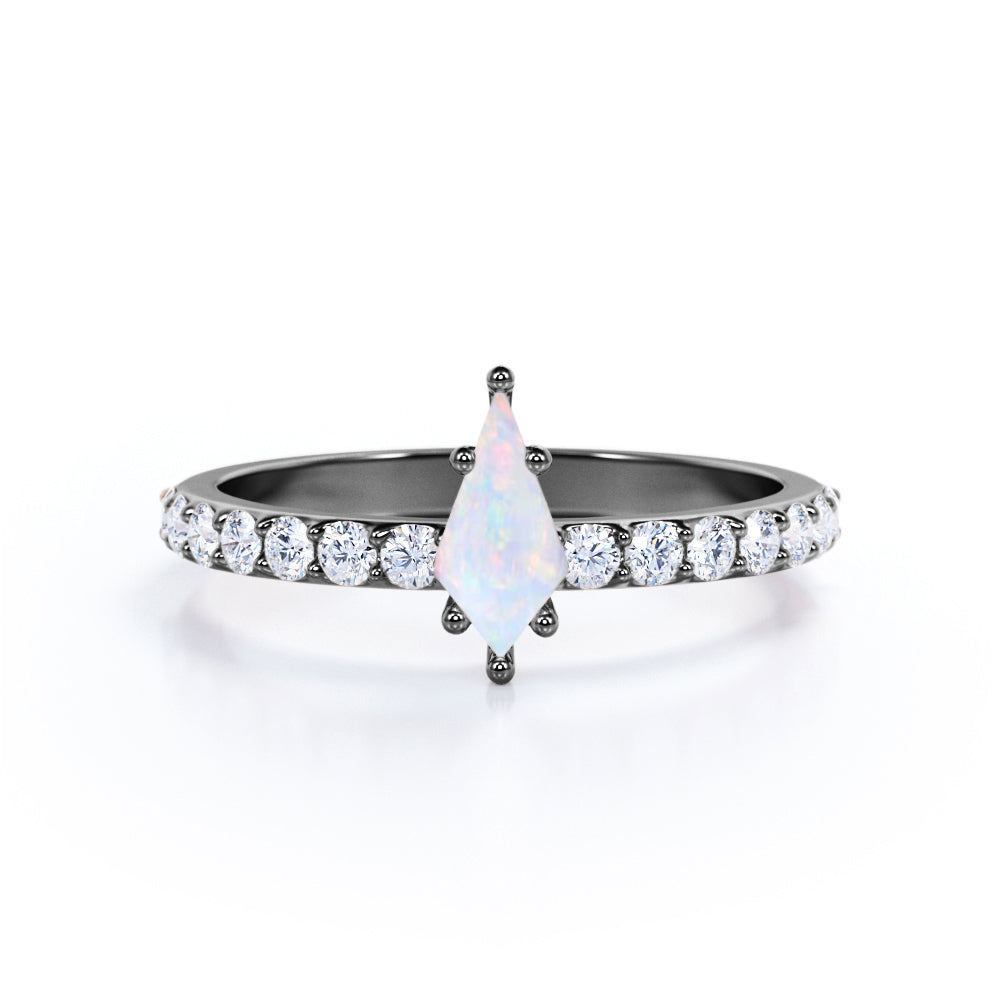 Geometric 1.25 carat Kite Shaped Precious Fire Opal And Diamond Six Prong Half Eternity Engagement Ring In Black Gold. Glistening and glamorous, this natural opal ring will win your heart. This exquisite design features a kite shaped center stone and 0.25 carat shimmering round white diamonds sparkles around the half eternity band of the stunning engagement ring. The white diamonds set in a black gold band exhibits amazing brilliance and unbelievable sparkle making this ring vivid and dramatic. This six prong opal and diamond engagement ring shimmers with all your beautiful moments to come. Simply gorgeous, modern and understated, this is the perfect engagement ring for a woman who wants something modern and beautiful. Handmade with utmost love and detailed attention, this geometric 1.25 carat kite shaped precious fire opal and diamond six prong half eternity engagement ring in black gold can also be customized into 18k Gold plating over silver, 10k Gold or 14k Gold as per your desired choice.