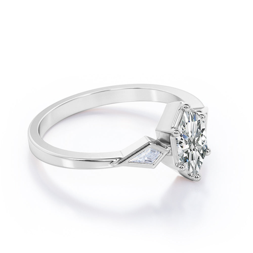 Let this Geometric 1 carat Hexagon Moissanite and Diamond Engagement Ring in Black Gold become her new favorite everyday jewelry. The three stone ring features a 0.75 carat hexagon Moissanite and flanked by kite shape Moissanite in east-west setting. Trio promise ring represents past, present and future, which can be a beautiful reminder of your memorable journey that you shared with your significant other and how you would love to hold on to her until the last day. The ring can be made in 18k gold over silver, 10k gold, 14k gold with the color of white gold, rose gold, yellow gold and black gold.