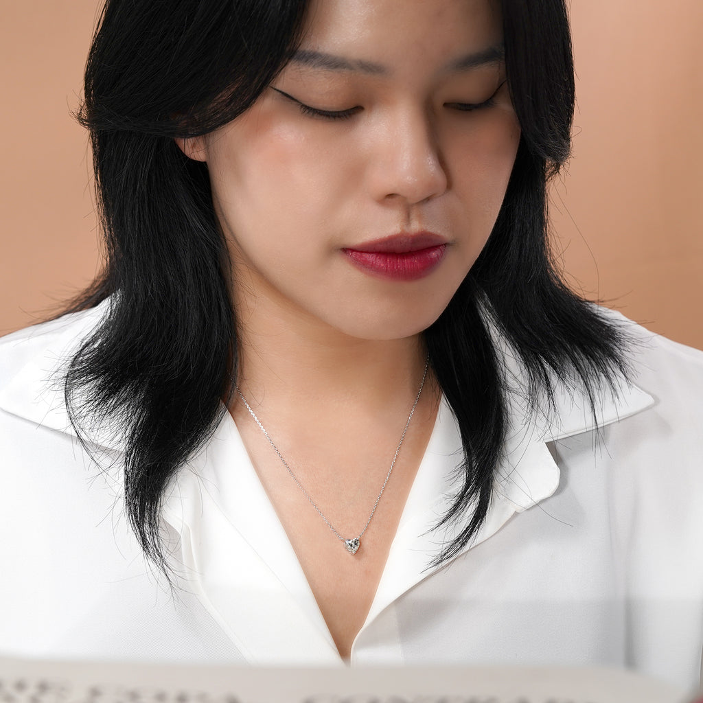 Start the greatest love story of your life with this Gorgeous 1 Carat Heart Cut Moissanite Pendant Necklace in 18K White Gold Plating over Silver. Professionally handcrafted into a fine heart cut by our experts in lapidary, this alluring pendant necklace with a moissanite stone comprises 1 carat moissanite on solid white gold plating over silver. Distinctive and extraordinary, this pendant necklace with a moissanite stone is well-suited for those who are not quite into normal lifestyle. With naked eyes moissanites look, shine and feel exactly like diamonds. Reflective properties of this pendant necklace with a moissanite stone will enhance happiness and attract positive vibes. Hanging in a silver cable chain that is secured by a spring ring clasp, this moissanite solitaire pendant necklace is beautiful and accessible since it is available at an affordable price. Moissanites are the most popular alternative gemstone for diamonds while being at lower and more affordable price. Considered as a symbol of timeless love and affection for your lover, this moissanite solitaire necklace can be a good choice for any special occasion, i.e. a birthday ring, an engagement or marriage proposal ring, a Valentines' day ring, etc. In regards to its hardness, moissanite is almost as hard as diamond which means that it is notably durable. Let’s impress her with this moissanite solitaire necklace and, surely, she will not regret it.