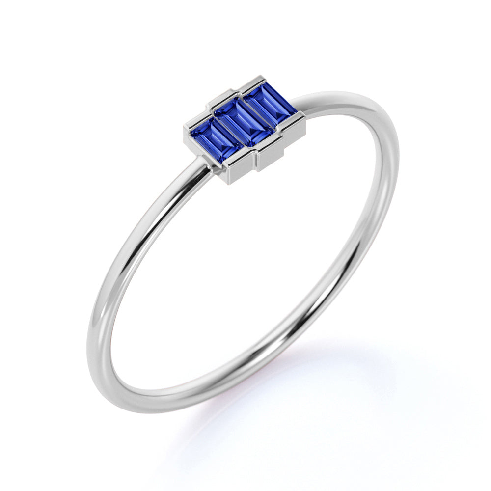 If you are done with all the unnecessary crazy design, this small blue sapphire ring is for you. This petite corn blue sapphire ring is so beautiful and durable despite its dainty look. This minimalist triad blue sapphire ring features an approximately .45 carat baguette cut certified blue sapphire.