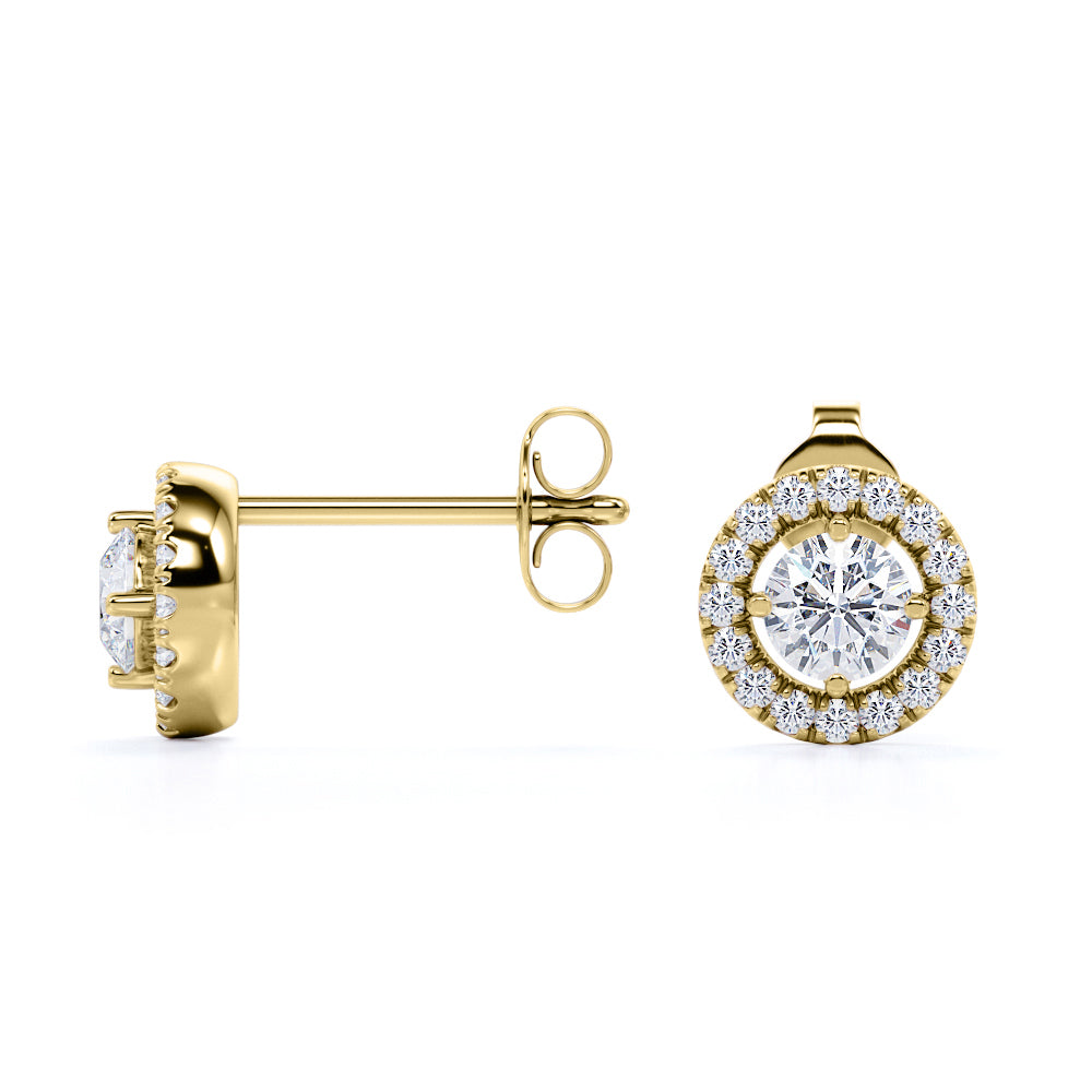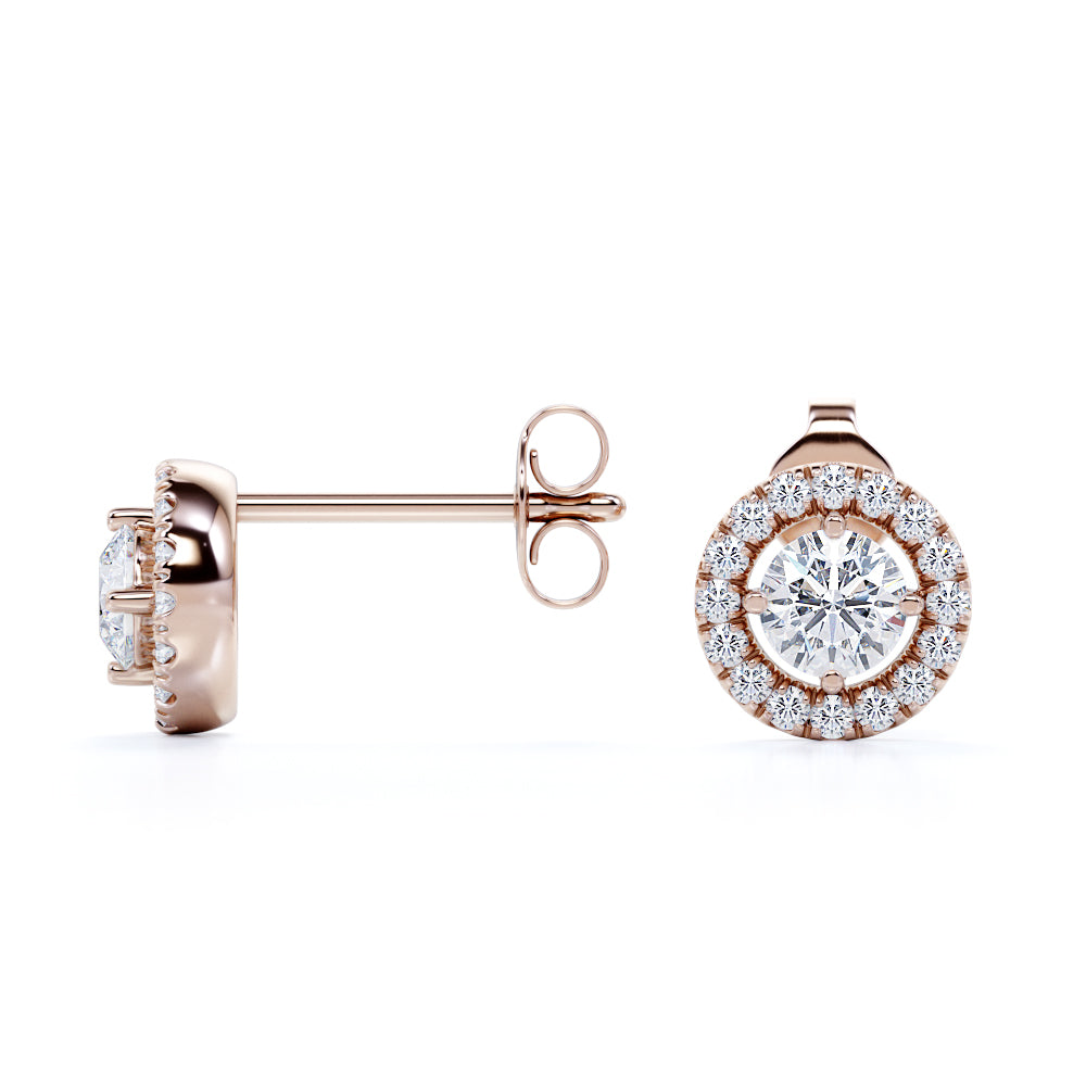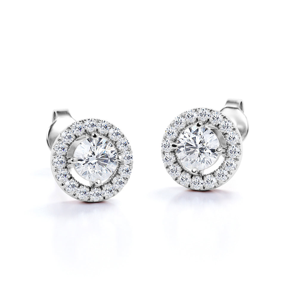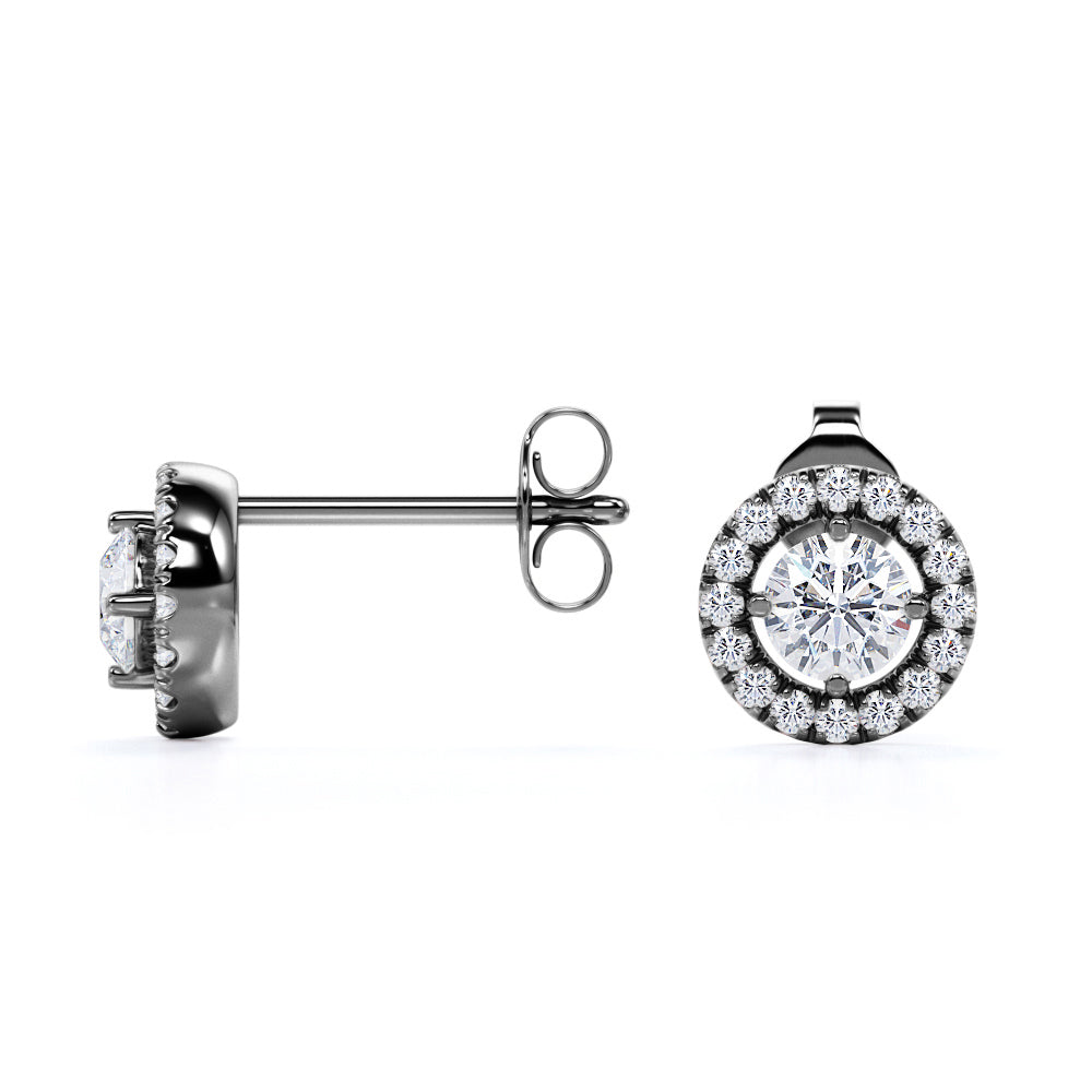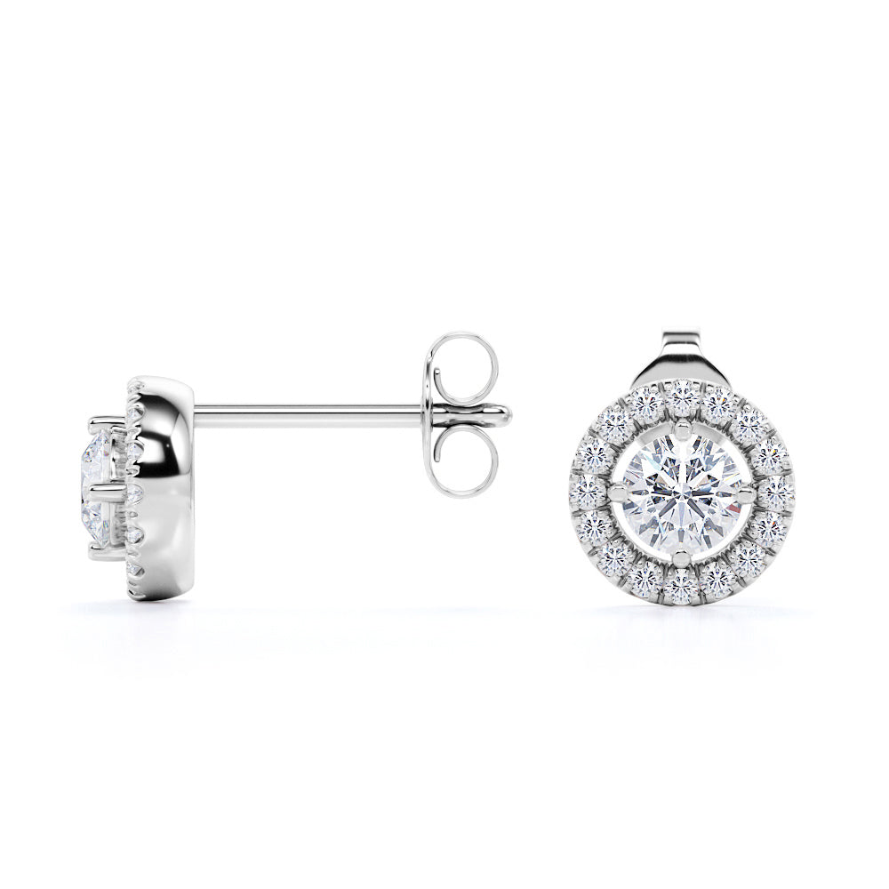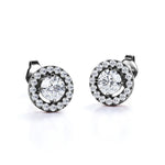 Half Bezel Set 1.10 Carat Round Certified Moissanite and Diamond Under Halo Modern Stud Earrings in White Gold
