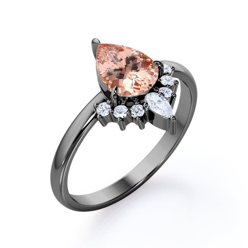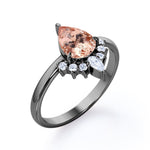 Express your love through this Half-Crown Halo 0.55 carat Pear Morganite and Moissanite Engagement Ring in Rose Gold. This promise ring showcases a 0.5 carat pear cut Morganite and surrounded by Moissanite at the top part; pear Moissanite is placed in the middle top in an upside down positioning like it is a reflection of Morganite. Follow by dainty round Moissanite that cascade down along the tear drop Morganite. This ring can be made in 18k gold over silver, 10k gold and 14k gold with the color of white gold, rose gold and black gold. You can get this beautiful fine jewelry at a very affordable for your beloved ones on their special day like birthday, mother's day, Christmas, etc.