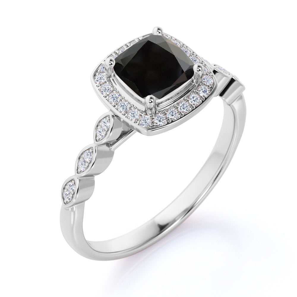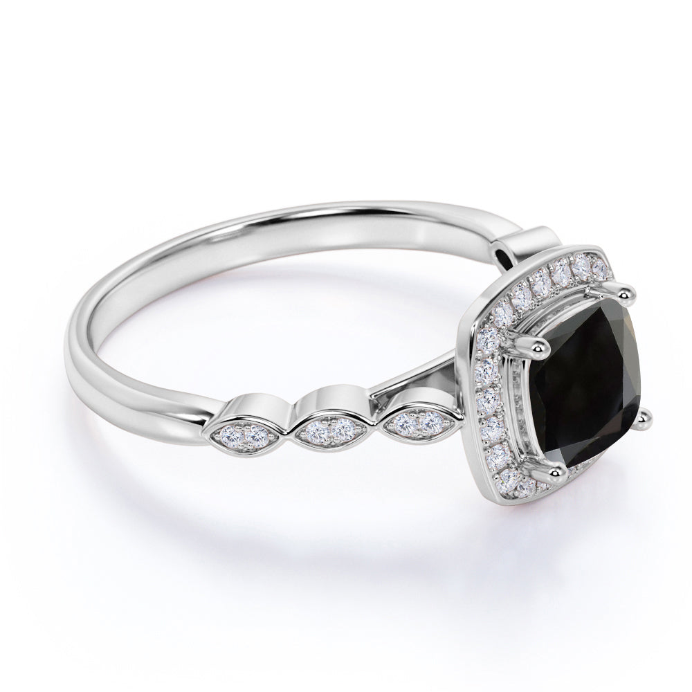 This petite black diamond ring is very cool and comfortable, it is also great for daily wear or even a proposal ring for her. The antique style black diamond ring is very famous worldwide and this design is one of our bestselling. This black diamond ring features an approximately 1 carat cushion cut lab created black diamond, surrounded by .50 carat authentic diamond accent, for a total weight of 1.50 carats.