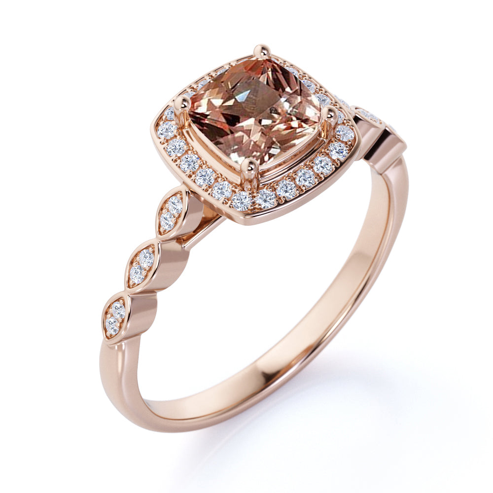 Half Eternity 1.50 Carat Cushion Champagne Morganite and Diamond Art Deco Engagement Ring in Rose Gold