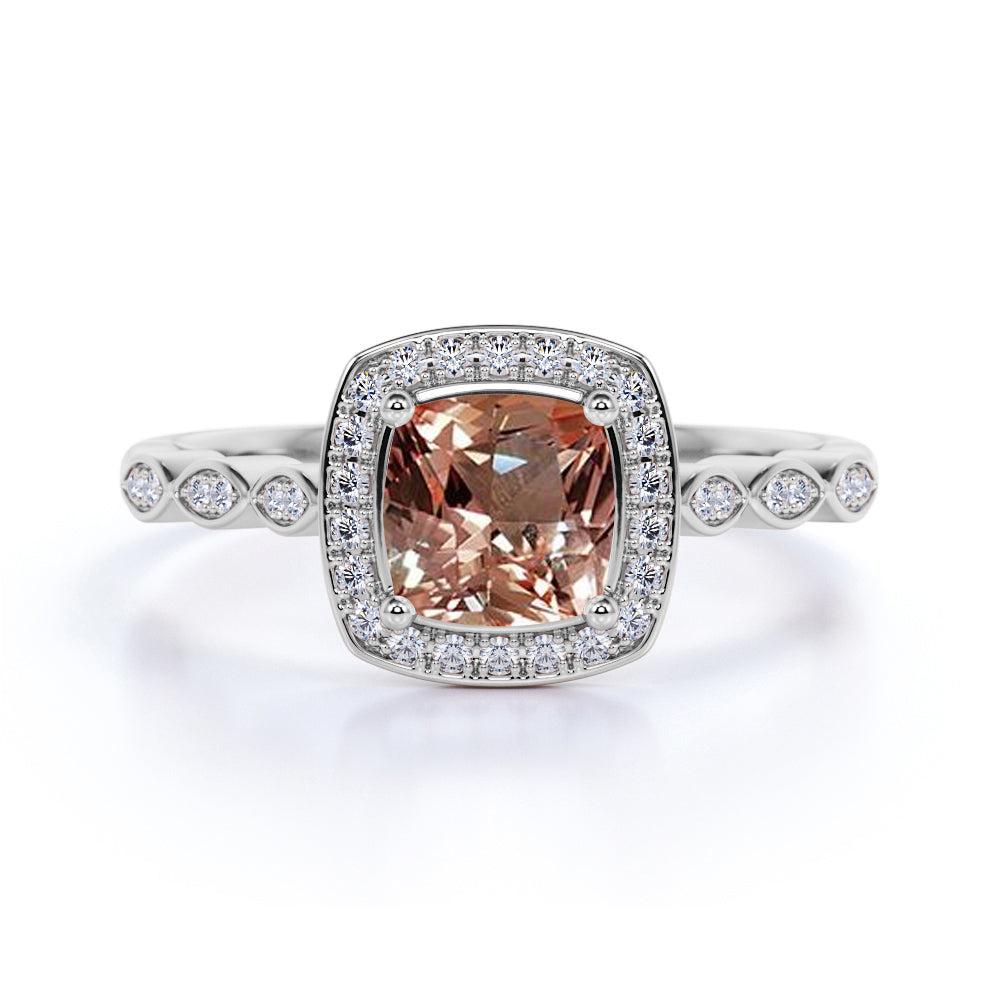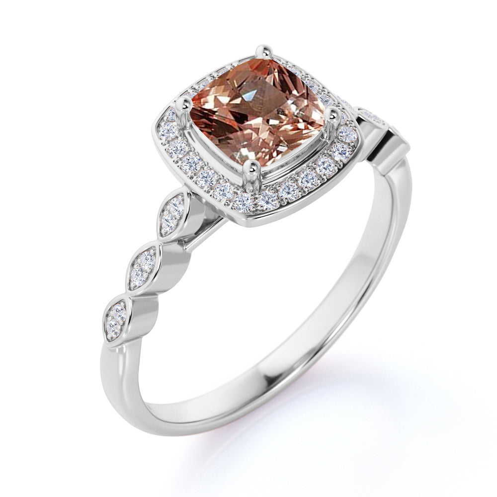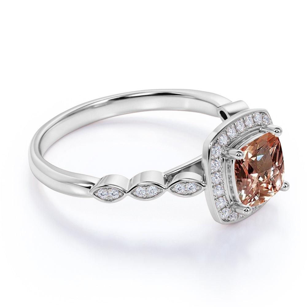 This minimalist morganite ring is very cool and comfortable, it is also great for daily wear or even a proposal ring for her. If you don't want a modern morganite ring, this classic morganite ring is the best for you. It reminisce your past and those times when you and her are still young lovers. This morganite ring features an approximately 1 carat cushion cut natural morganite, surrounded by .50 carat authentic diamond accent, for a total weight of 1.50 carats.
