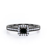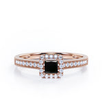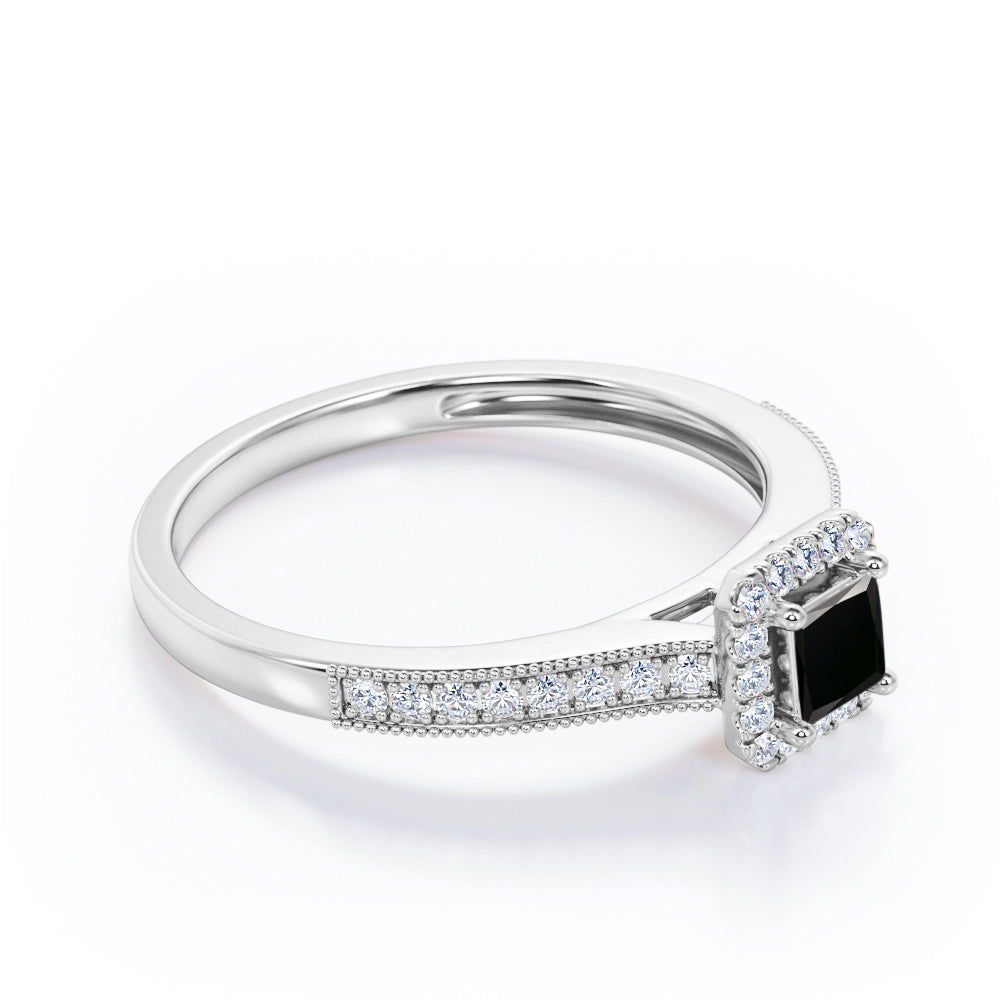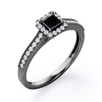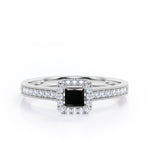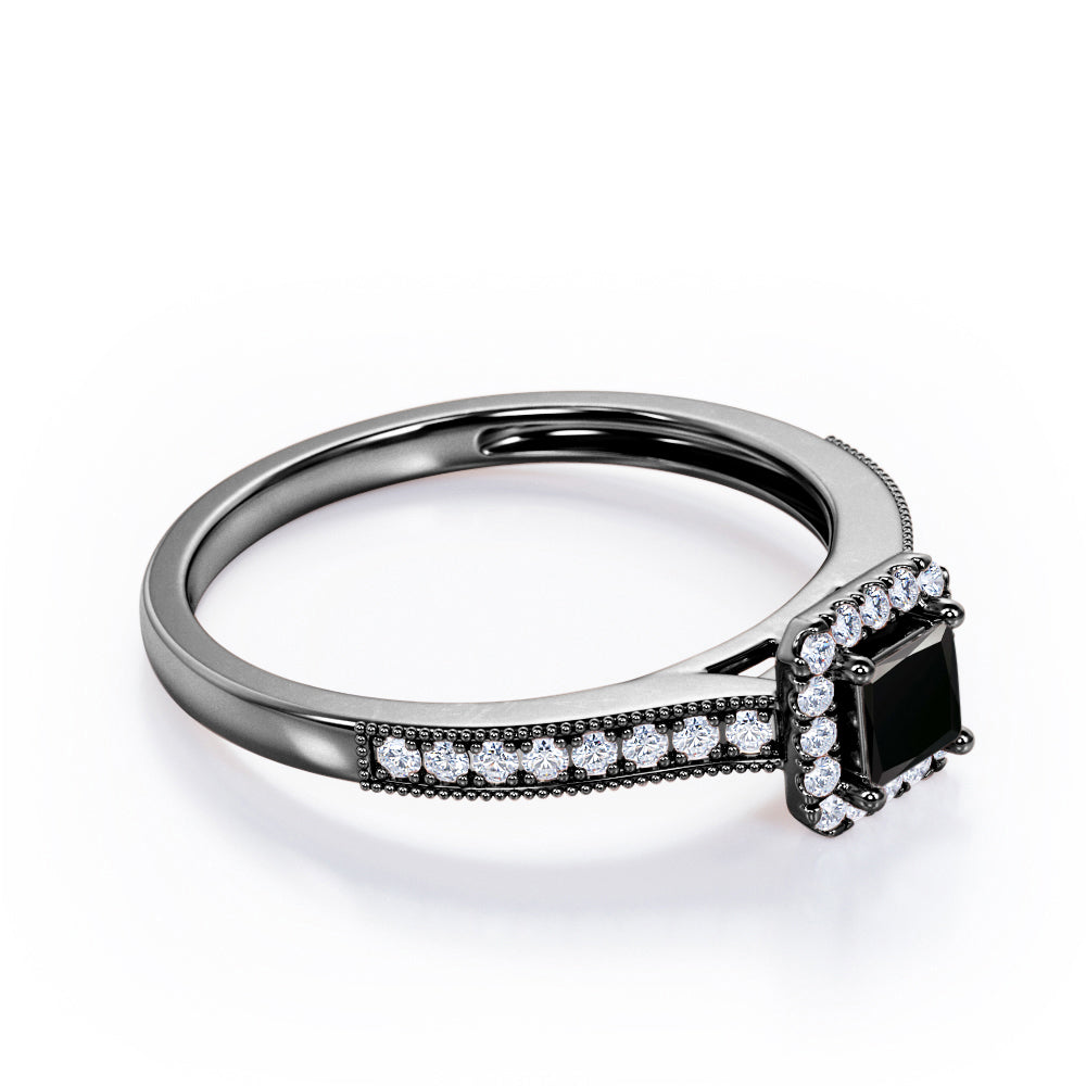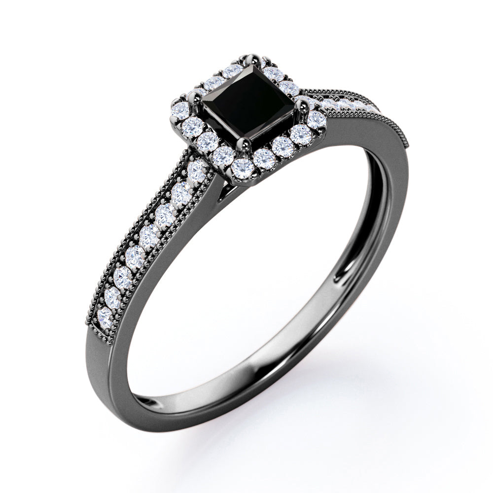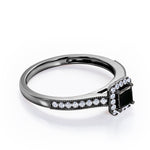 With this Halo Design 1.25 carat Princess Cut Black Diamond Milgrain-Bordered Pave-Channel Engagement Ring in White Gold, your better half will easily stand out from the crowd. Hand-cut with deftness into a lovely shape princess cut by our most talented jewelers, this gorgeous Black Diamond jewelry integrates 1 carat Black diamond gemstone in the center with 0.25 carat diamond side stones. Distinct and unusual, this gem engagement ring is an excellent choice. This inexpensive engagement ring will accentuate any outfit the wearer chooses to put on. Beautiful and affordable, this affordable Black Diamond engagement ring is stunning and inexpensive, thanks to its reasonable price. This Black Diamond jewelry, the birthstone ring for April, symbolically represents love and dedication, is the best gift you can give to your significant other. Additionally, this natural engagement ring can be customized, either in rose gold, white gold, black gold, or yellow gold, upon customer request. Let's show her how much you care by giving her this Black Diamond ring for women.
