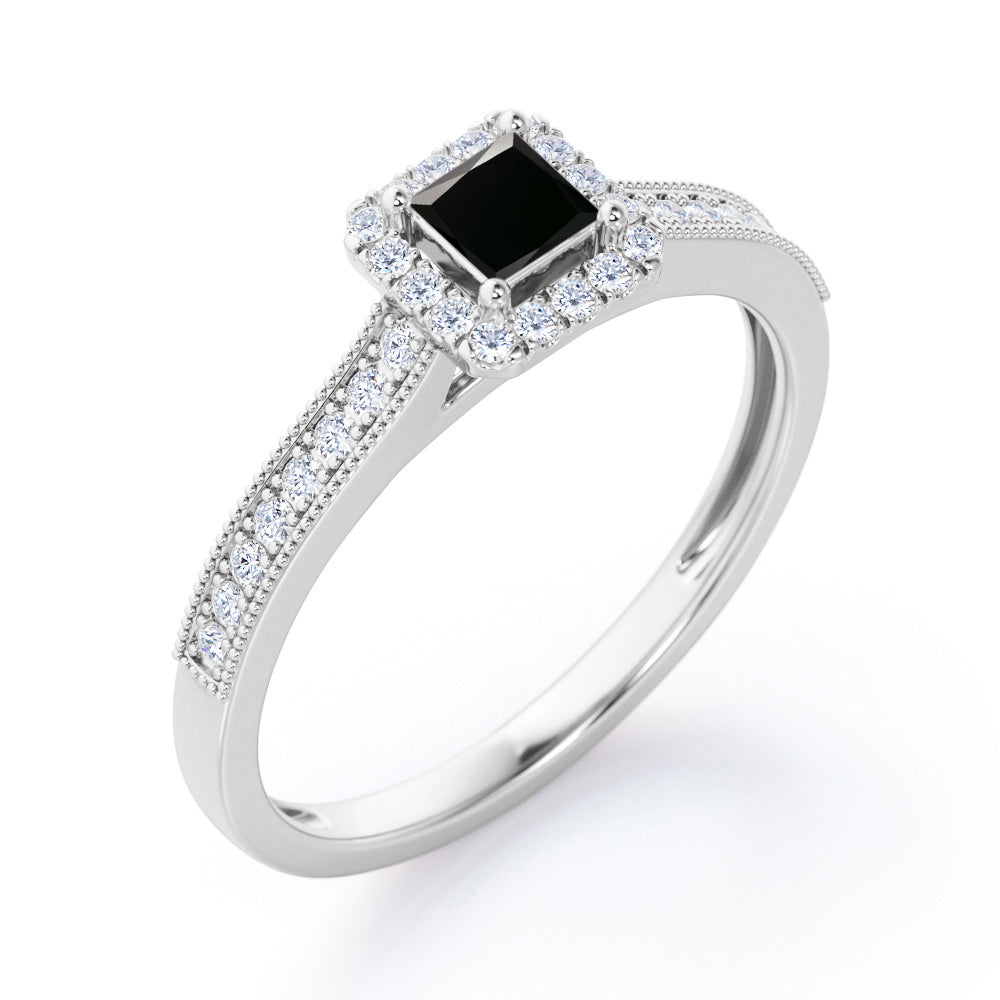 Halo Design 1.25 Carat Princess Cut Black Diamond Milgrain-Bordered Pave-Channel Engagement Ring in White Gold