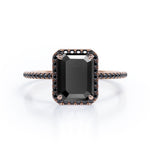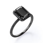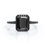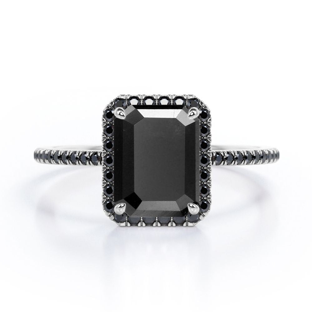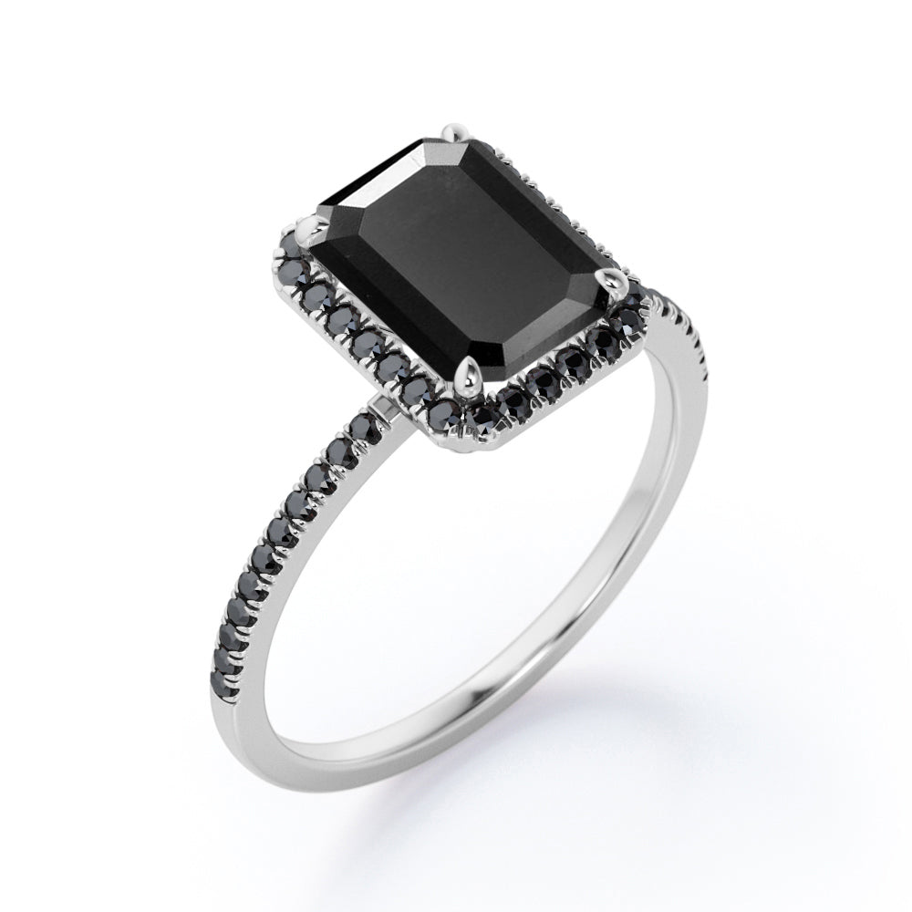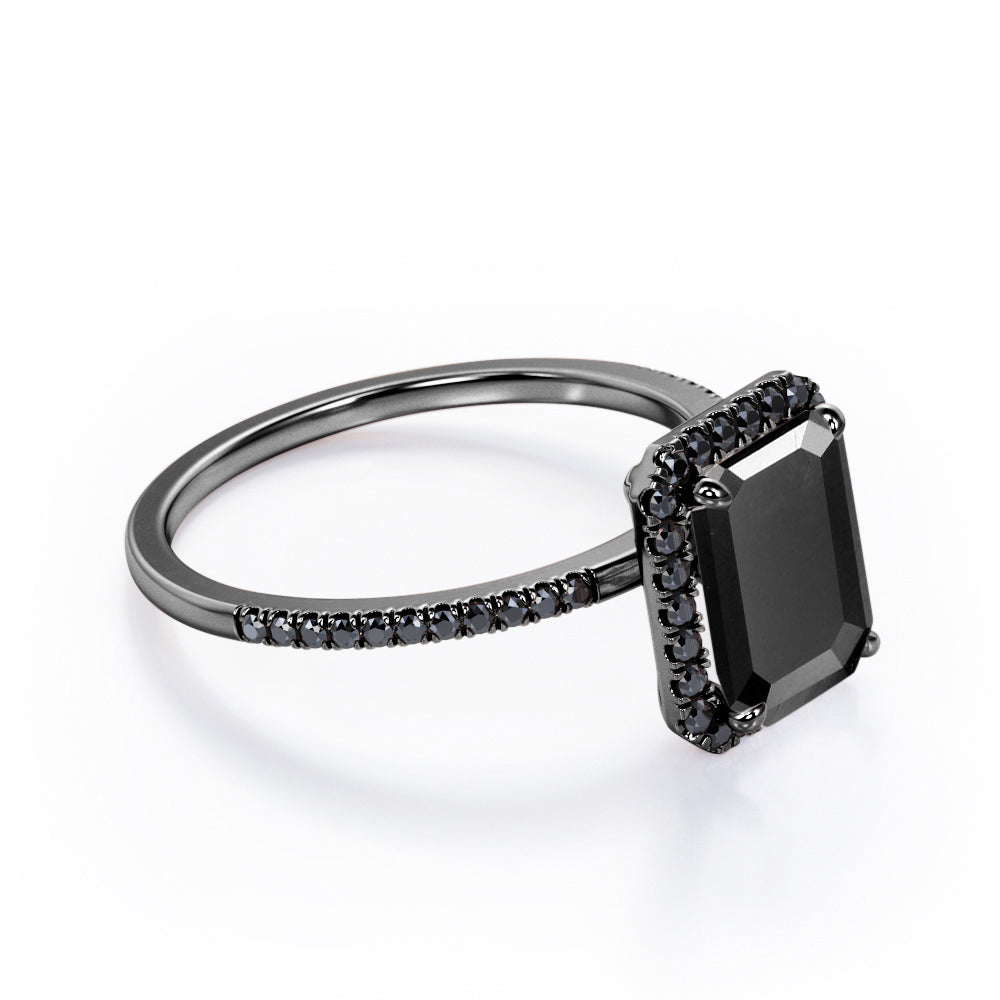 Be shinily standout from the crowd with this Halo-Style 1.5 TCW Emerald Cut Lab Created Black Diamond Engagement Ring with Pave Accents in White Gold. Professionally handcrafted into a fine emerald cut by our skilled jewelers, this appealing black diamond ring integrates total 1.5 carat lab created black diamond on solid white gold. Distinctive and extraordinary, this black diamond jewelry is well-suited for those who are not quite into normal lifestyle. With its enchanting color, this black diamond band will absolutely enhance every style of its wearer. this black diamond ring is beautiful and accessible since it is available at an affordable price. Considered as a symbol of eternal love and affection for your lover, this synthetic black diamond ring can be a perfect gift for any occasion like engagements, Valentine's day, mother's day or anniversary. Additionally, this synthetic black diamond ring can be customized, either in white gold, rose gold, yellow gold or black gold in 10k and 14k gold metal options upon customer request. Let’s impress her with this black diamond engagement ring and she will be eternally joyful.