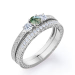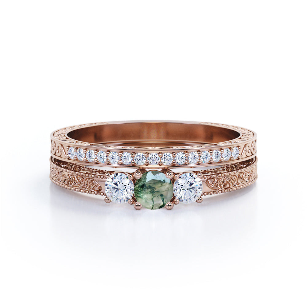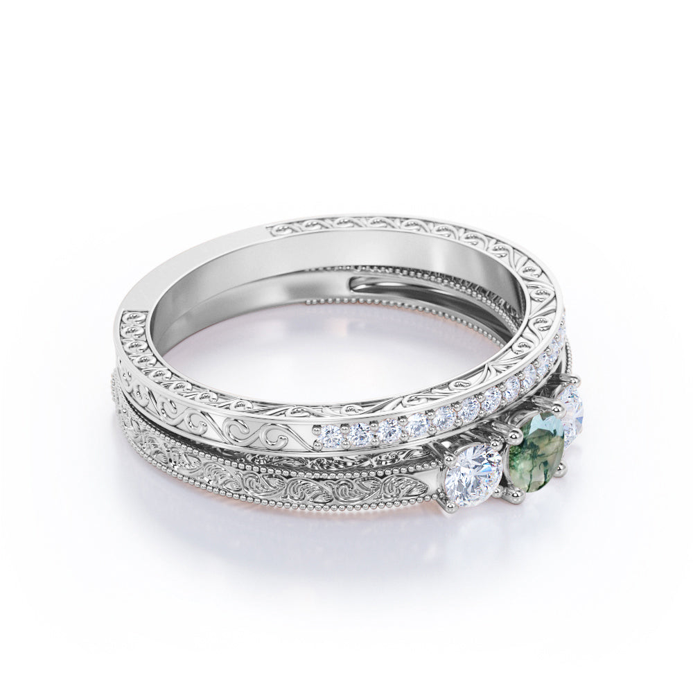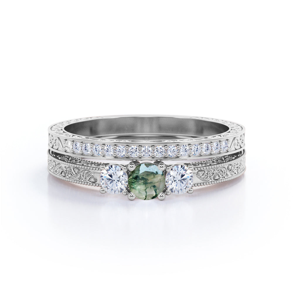 Handmade Antique 1 carat Round Moss Agate and Moissanite 3 Stones Bridal Ring Set in White Gold