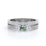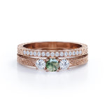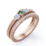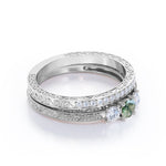 The Handmade Antique 1 carat Round Moss Agate and Moissanite 3 Stones Bridal Ring Set in White Gold is ready for you to take home. This wedding set contains 2 fine jewelry pieces; the engagement ring boasts trio stones atop the ring with 0.5 carat round natural Moss agate and 0.5 carat round Moissanite and the wedding band presents a beautiful line of Moissanite. Trilogy promise ring presents past, present and future while green Moss agate is believed to bring you good fortune, it will refresh your bad energy in the past and fill your soul with all the positivity. Garnished the band with nature-inspired engraving and bordered with Milgrain bead decoration. Vintage wedding band showcases Moissanite in surface prongs. They are set side by side and create a pattern that looks neat and soothing. Scroll pattern Filigree is added to the band, syncing to the anniversary ring. Both antique rings can be customized in 18k gold over silver, 10k gold, 14k gold and 18k gold with the color of white, rose, yellow and black gold.