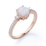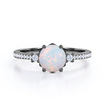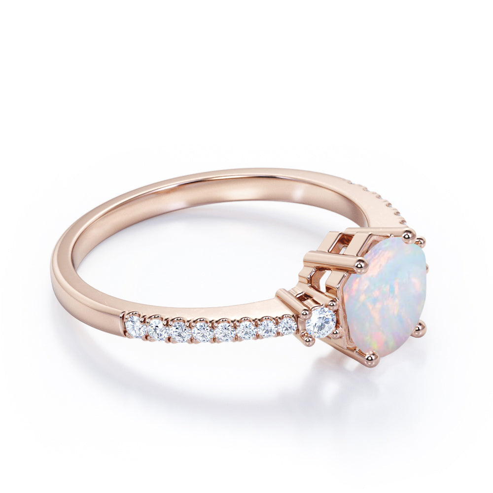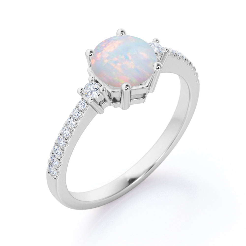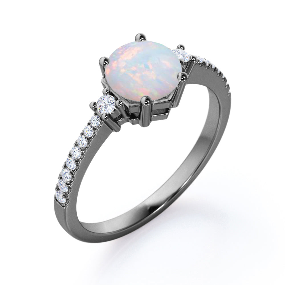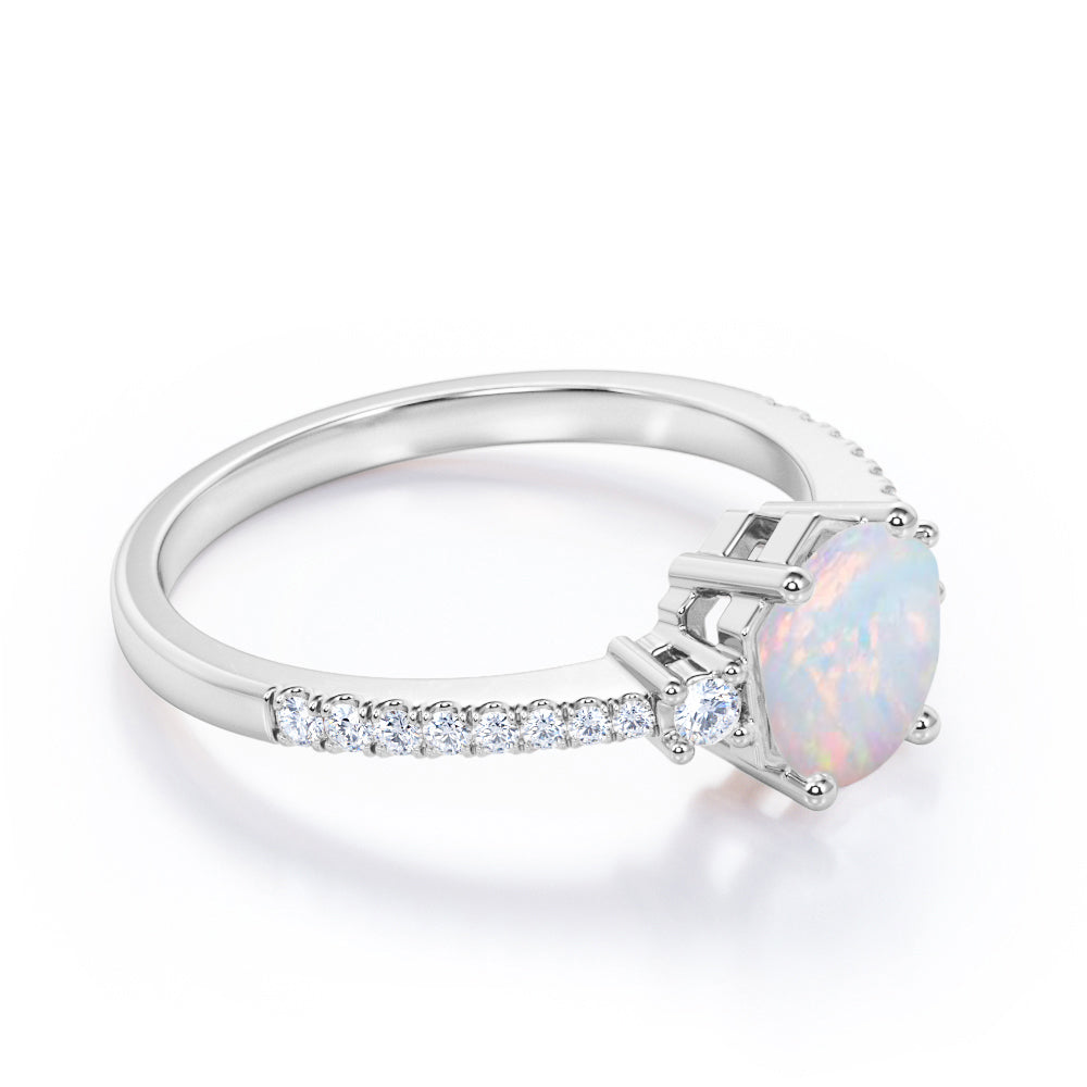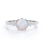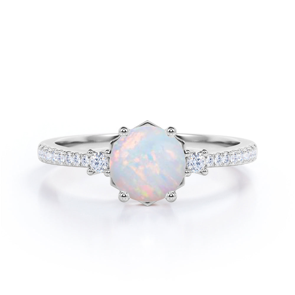 Hexagon Set 1.35 Carat Brilliant Round Ethiopian Opal And Diamond Pave Engagement Ring In White Gold. An alternative center stone like this natural opal calls for an equally alternative setting, a white gold hexagonal halo is just that. This geometric ring boasts an antique feel with a brilliant round cut center stone in a four prong hexagon setting. The glistening white diamonds pave set in the white gold band adds an extra touch of glamour. With its unique appearance, you can be sure that no any other rings will look exactly alike. This three stone engagement ring features 1 carat Ethiopian opal at the center and is surrounded by pave set dazzling diamonds of 0.35 carats. This hexagon set 1.35 carat brilliant round Ethiopian opal and diamond pave engagement ring in white gold can also be customized into 18k Gold plating over silver, 10k Gold or 14k Gold as per your preferred choice.