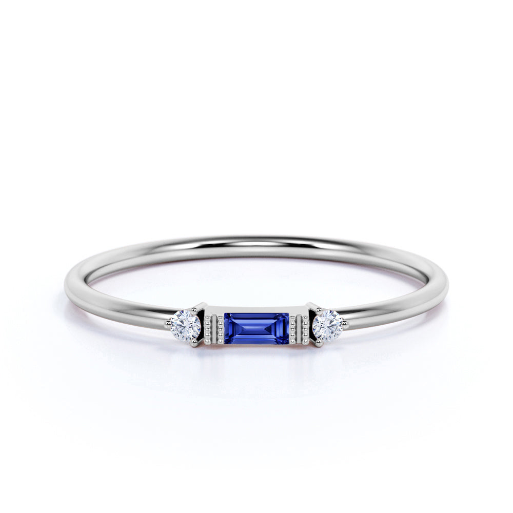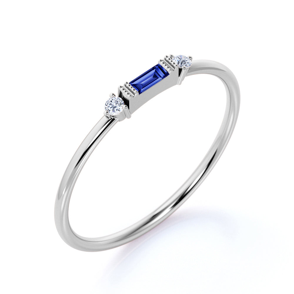 Horizontal Baguette Cut Royal Blue Sapphire and Diamond Dainty Stackable Ring Band in White Gold