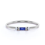 Horizontal Baguette Cut Royal Blue Sapphire and Diamond Dainty Stackable Ring Band in White Gold
