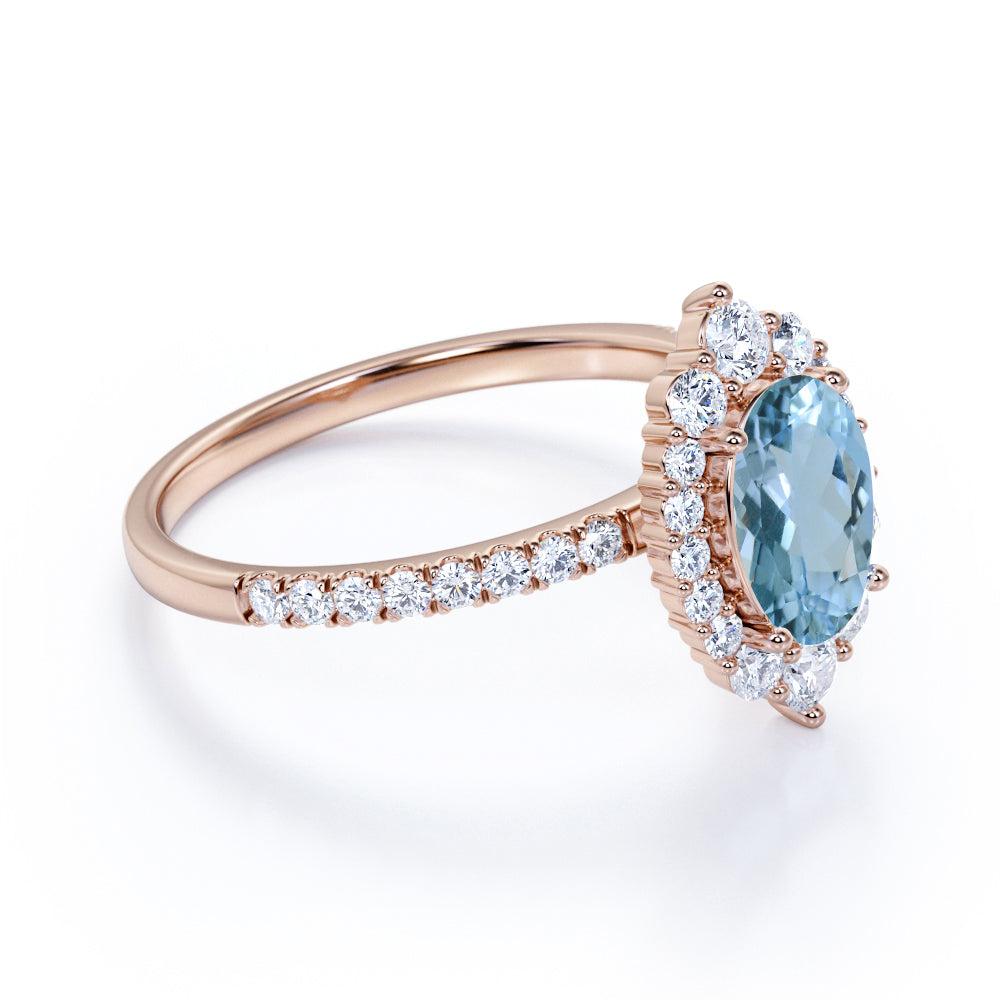 Huge 2.50 Carat Oval Aquamarine and Diamond Clustered Engagement Ring in Rose Gold