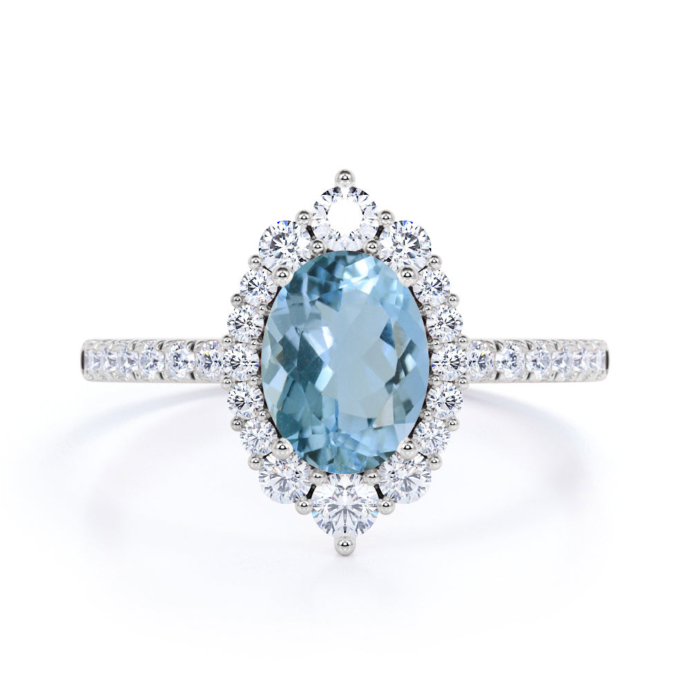 The vintage aquamarine ring is quite amazing, since majority of us likes to see a vintage look, especially with an engagement ring that is absolutely beautiful. If you don't want a modern aquamarine ring, this classic aquamarine ring is the best for you. It reminisce your past and those times when you and her are still young lovers. This aquamarine ring features an approximately 2 carat oval shape natural aquamarine, surrounded by .50 carat certified side diamonds, for a total weight of 2.50 carats.