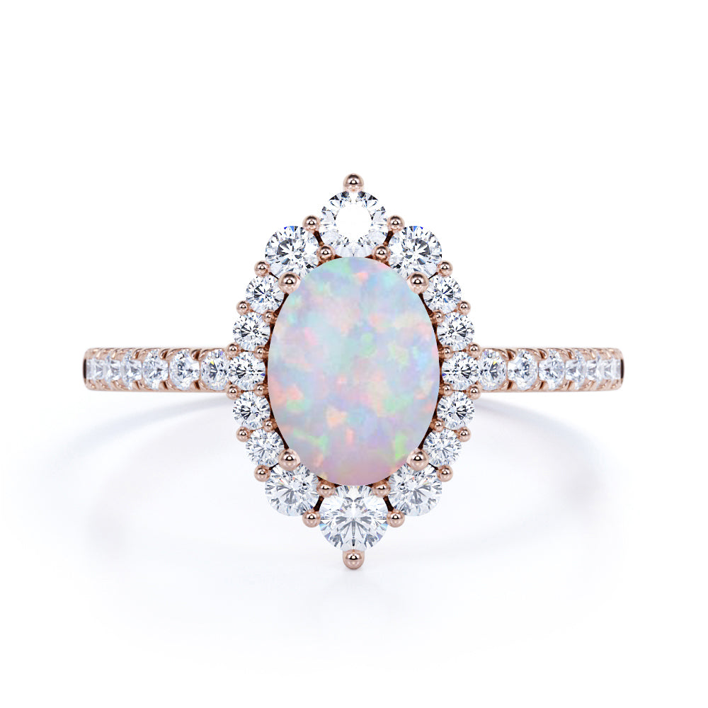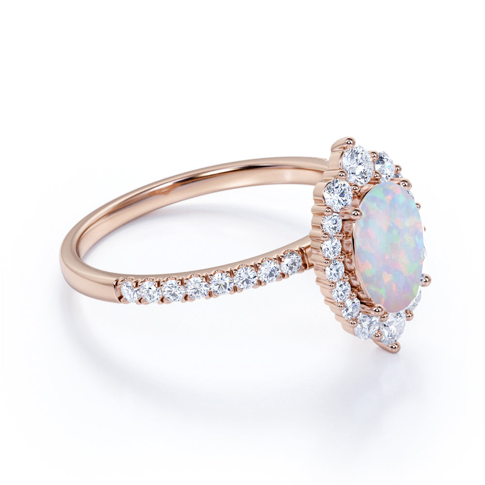 Huge 1.50 Carat Oval Mexican Fire Opal and Diamond Clustered Engagement Ring in Rose Gold