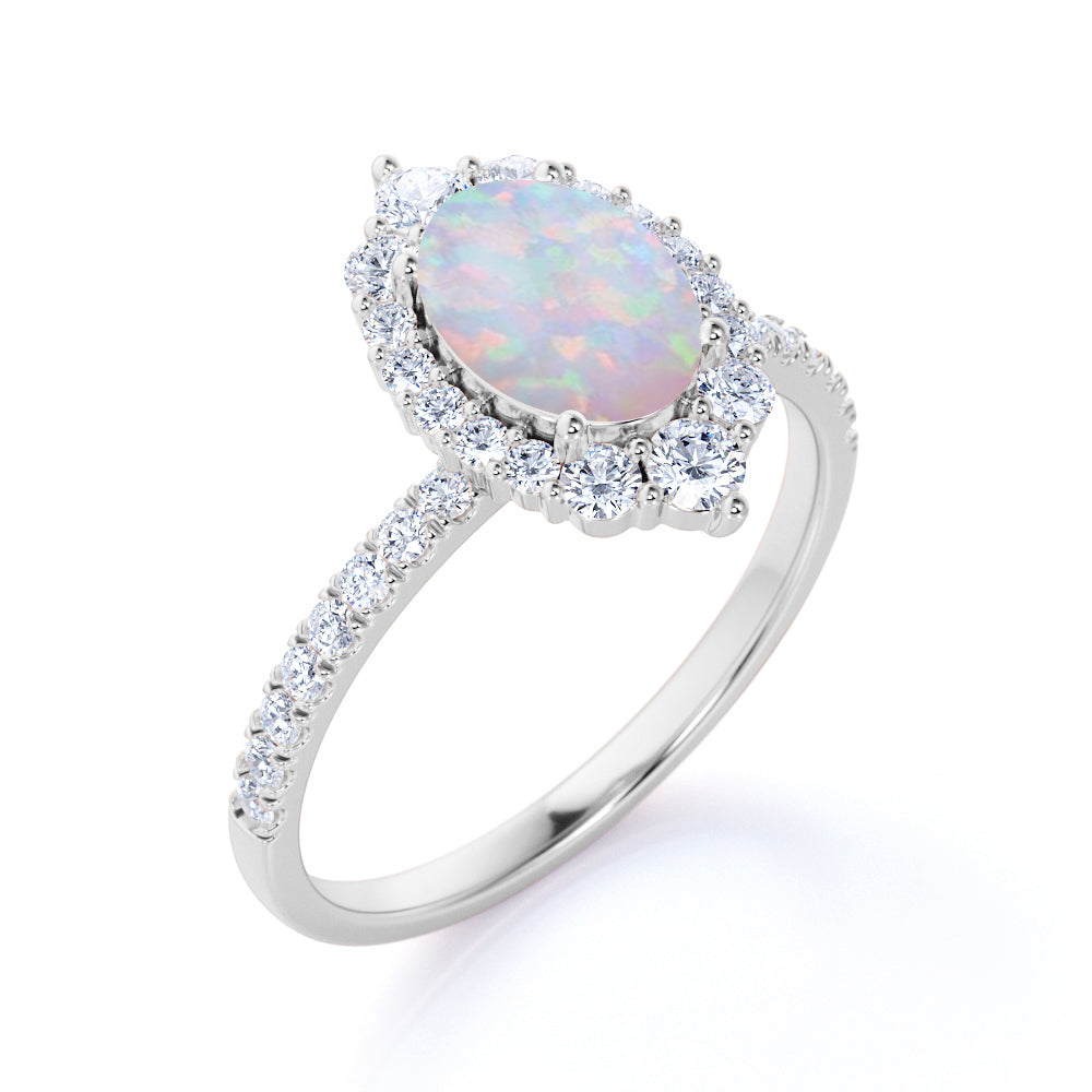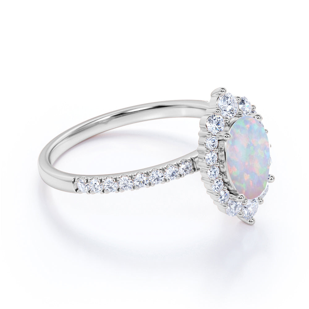 This opal ring is the best gift for any occasions, birthday, proposal ring, friendship ring, statement ring or just a casual ring. This affordable opal ring is the best for you, not just by the look but the price and quality as well. This opal ring features an approximately 1 carat oval shape natural opal, surrounded by .50 carat certified side diamonds for gold ring and moissanite for silver ring, for a total weight of 1.50 carats.