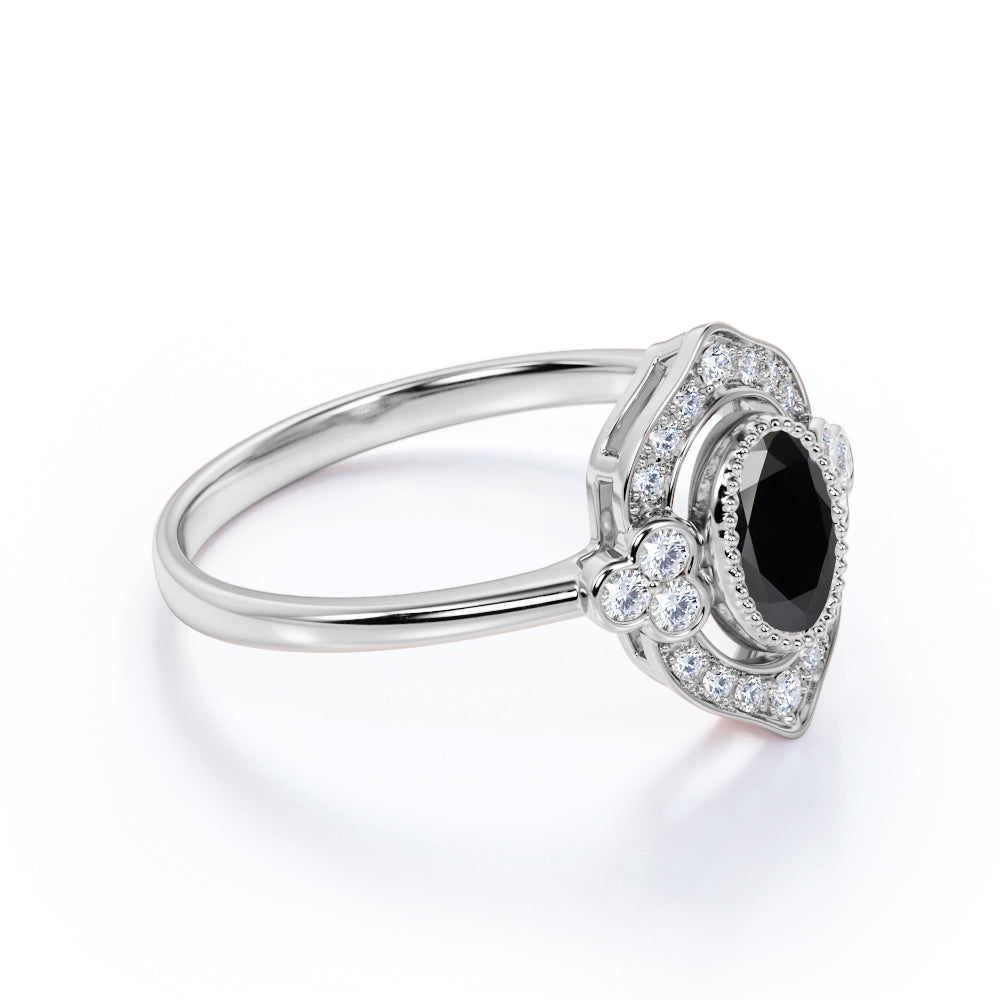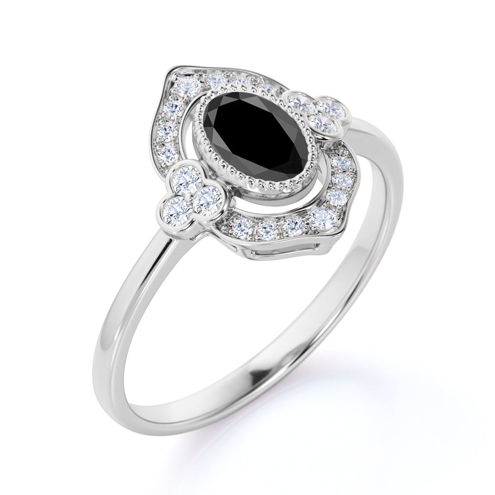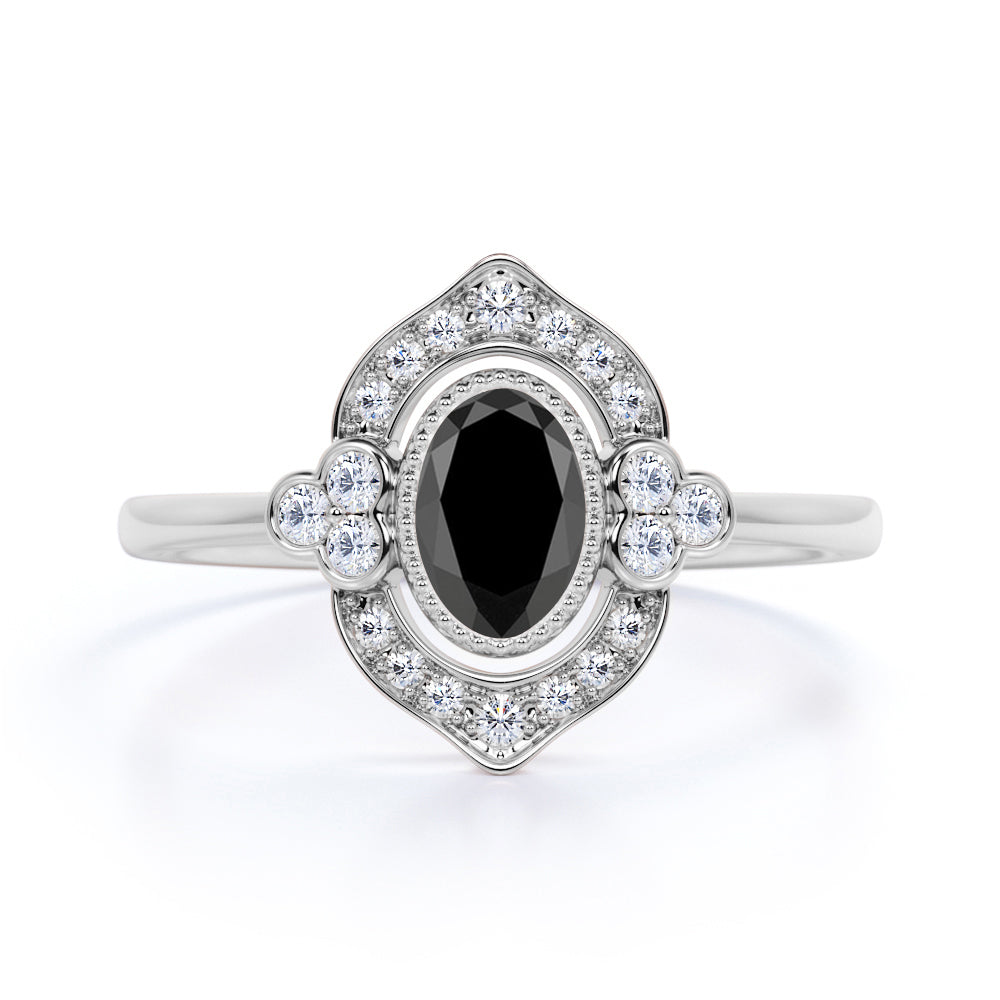 The vintage black diamond ring is quite amazing, since majority of us likes to see a vintage look, especially with an engagement ring that is absolutely beautiful. The antique style black diamond ring is very famous worldwide and this design is one of our bestselling. This black diamond ring features an approximately 1 carat oval cut lab created black diamond, surrounded by .50 carat authentic side diamonds, for a total weight of 1.50 carats.