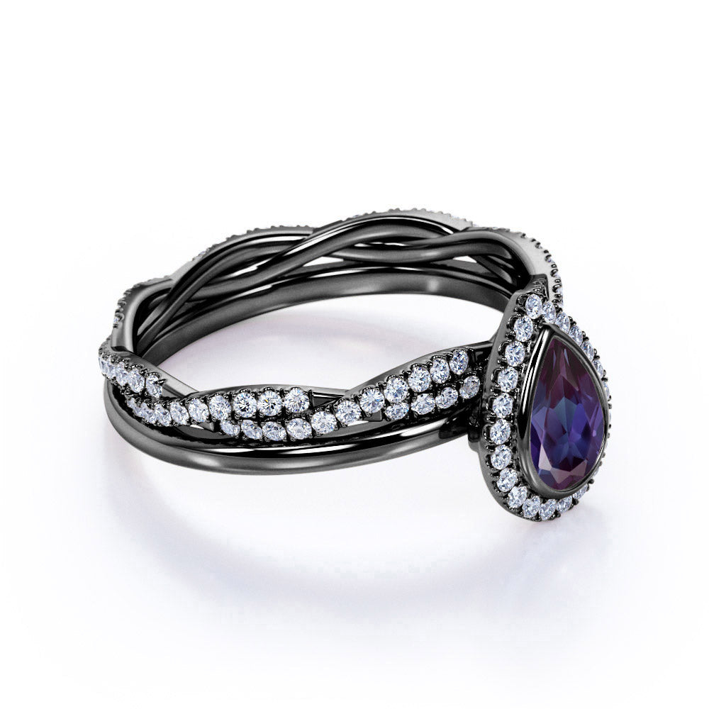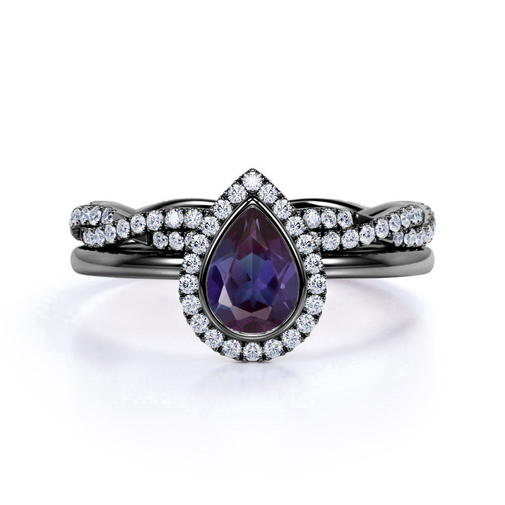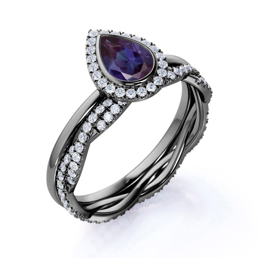Be on cloud nine with this Infinity Bezel Set 1.75 Carat Pear Cut Synthetic Alexandrite and Diamond Eternity Bridal Set Rings. This crossover rings feature 1 carat pear cut lab grown Alexandrite and .75 carat real genuine side diamond for gold ring and moissanite for silver ring. This intricate wedding ring sets can be customized to either 10k, 14K and Gold over Silver and either Black Gold, Rose Gold, White Gold or Yellow Gold. Also, as your satisfaction is our most priority, we will do our best to have your handmade jewelry be carefully and beautifully crafted by our expert jewelers. The order also comes with a 30-day full refund policy. Crowned as June birthstone, this flawless synthetic Alexandrite ring will bring hope as well as encouragement to you. Design your own flawless look with this ring which you can customize it as per your satisfaction. This flawless ring will be a perfect fit for you love story as it is believed that joy enters the lives of people through the stone. Enrich your charming love story and strengthen your bond with this color-change man made Alexandrite ring. This simulated Alexandrite ring gives a vivid grass green color in daylight and displays an intense raspberry red in candescent light. This flawless simulated Alexandrite ring will be a perfect match for those who are looking for beautiful, classic, vintage and antique synthetic Alexandrite pieces of fine jewelry. This ring will bring love and hope to its wearer. This ring is available at a very affordable price yet it offers a very expensive and gorgeous look on your finger. Sparkle your finger with this mystic lab made Alexandrite ring which is perfect for any occasion and everyday wear. It is the perfect match for those who are looking for a remarkable gemstone rings as Alexandrite embodies their own unique color-change ability and uplifting meaning.