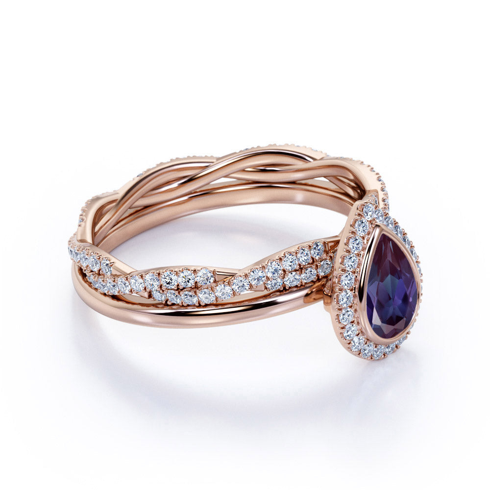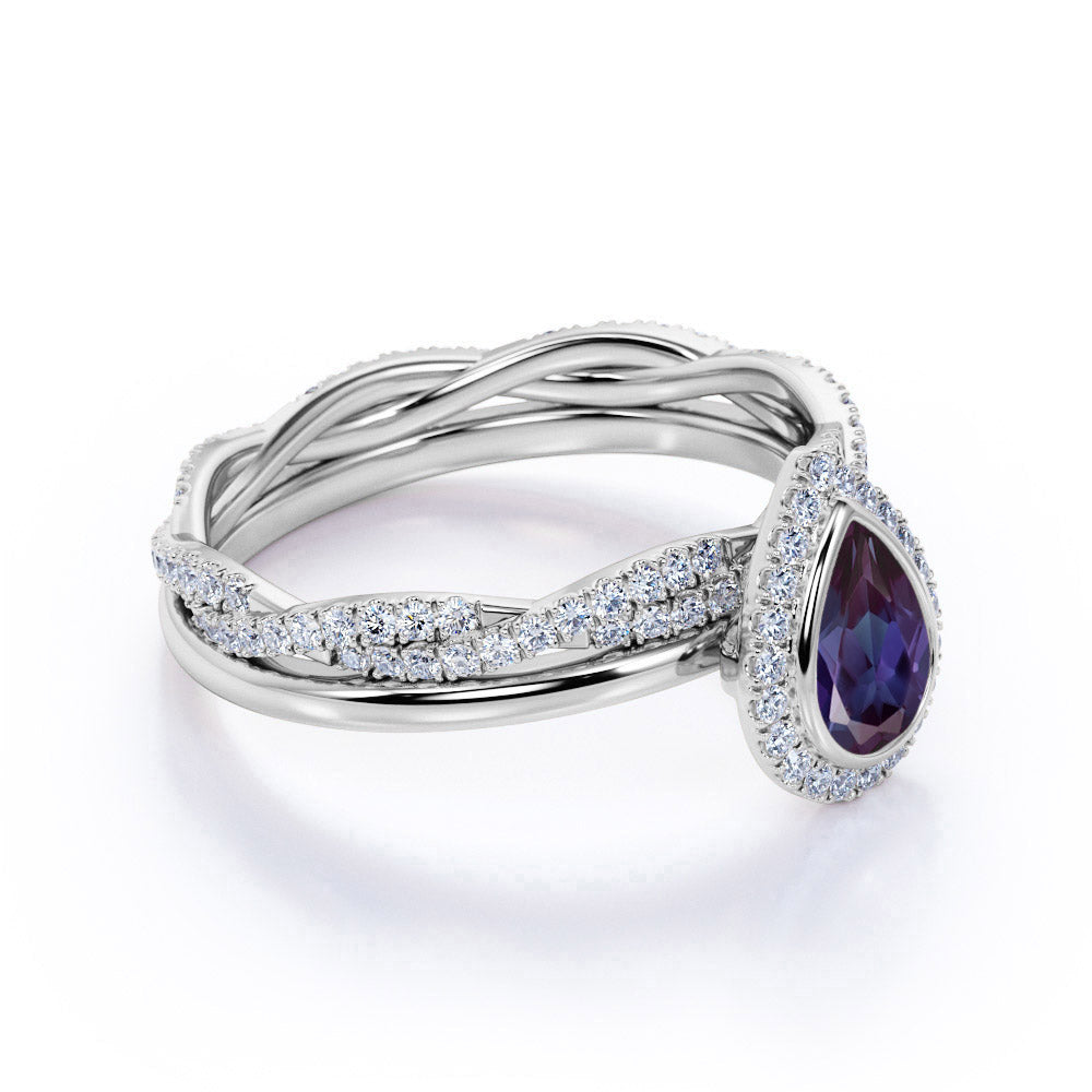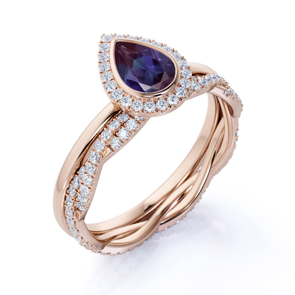 Infinity Bezel Set 1.75 Carat Pear Cut Synthetic Alexandrite and Diamond Eternity Bridal Set Rings