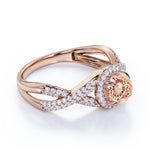 An elegant 1.50 Carat Round Cut Morganite and Diamond Engagement Ring in Rose Gold. The infinity inspired engagement ring is made with 1 carat natural morganite and 0.50 carat real diamonds, for a total weight of 1.50 carats.