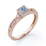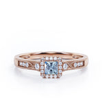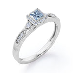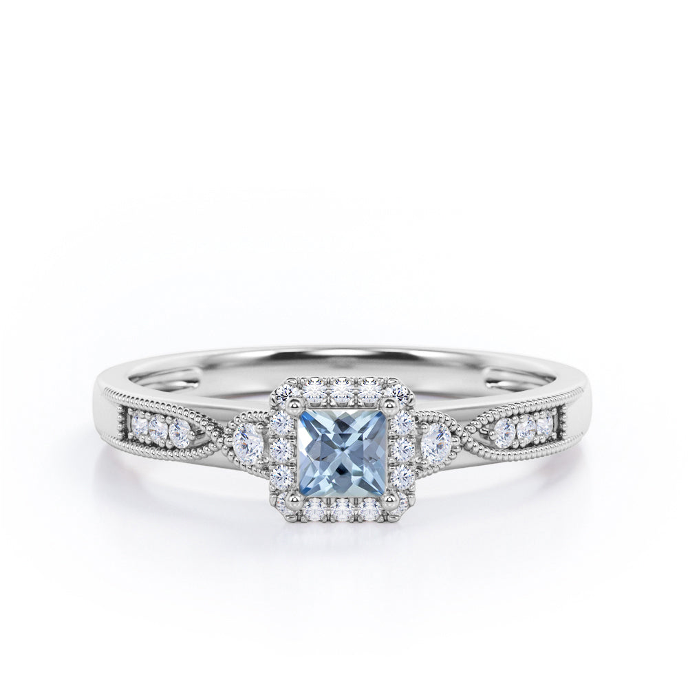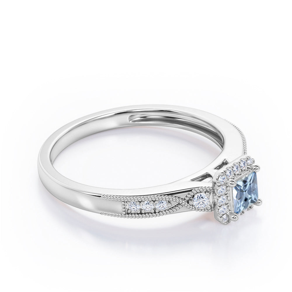 With this Infinity Milgrain - 1.15 Carat Princess Cut Aquamarine - Petite Pave Channel - Halo Engagement Ring in White Gold, you can make your proposal day unforgettable. Handcrafted with care into a wonderful princess cut Aquamarine by our lapidary expertise, this splendid real Aquamarine ring for women features a a 1 carat Aquamarine in the center with diamond side stones. Distinct and unusual, this real Aquamarine engagement ring is ideal for those who wish to express their charisma and uniqueness. This affordable Aquamarine engagement ring will accentuate any outfit the wearer chooses to put on. This natural engagement ring is a great choice for any woman's jewelry collection. This cheap engagement ring is a great option if you are in search for something truly special to give to your special someone. Additionally, this affordable Aquamarine engagement ring can be customized to your own choice of metal colors: white gold, rose gold, black gold, or yellow gold. Your love story will be complete with this Aquamarine anniversary ring.