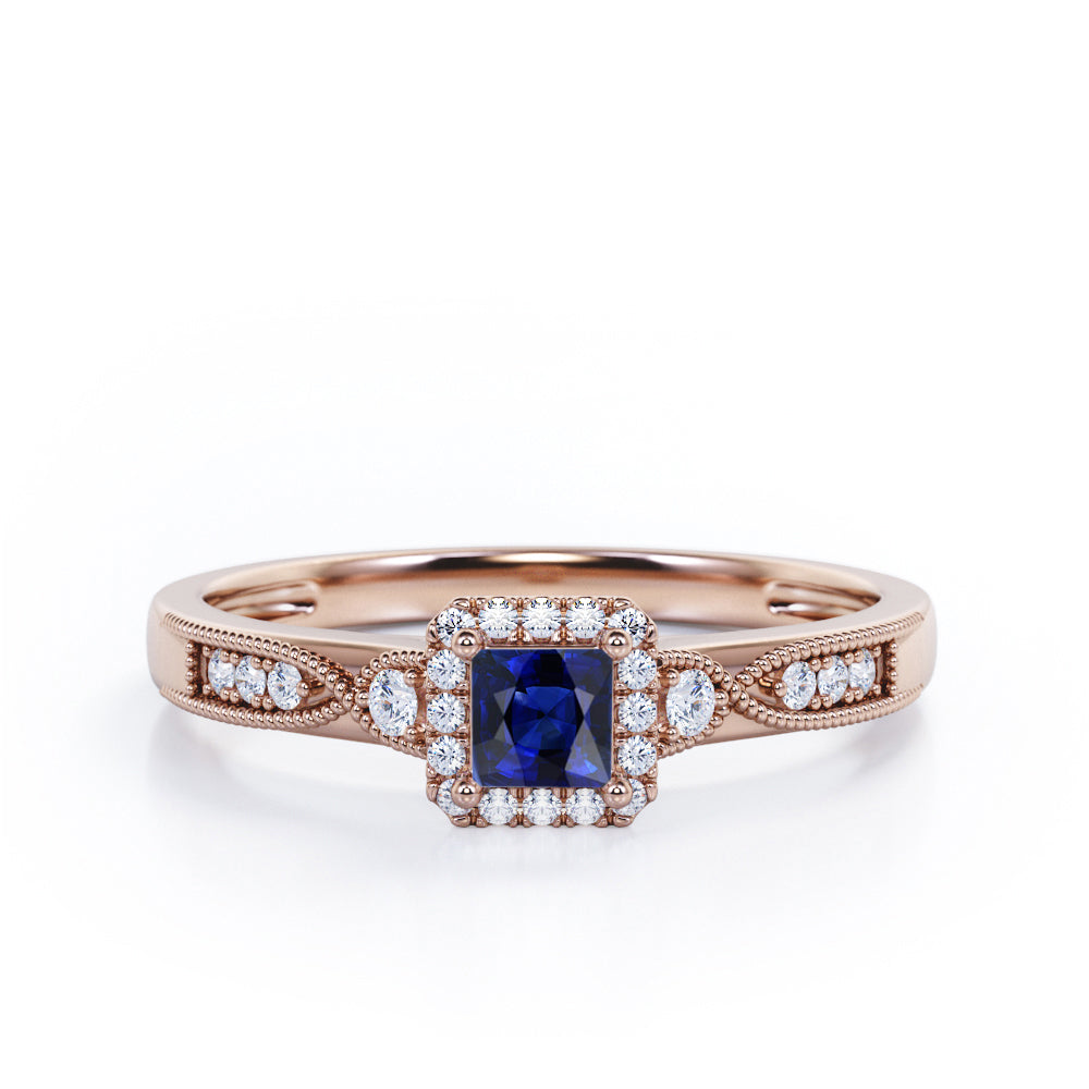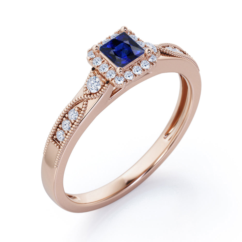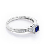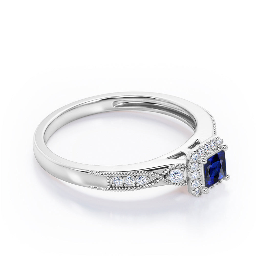 With this Infinity Milgrain - 1.15 Carat Princess Cut Blue Sapphire and diamond - Petite Pave Channel - Halo Engagement Ring in White Gold, you can make your proposal day unforgettable. Handcrafted with care into a wonderful princess cut Blue Sapphire by our lapidary expertise, this splendid real Blue Sapphire ring for women features a a 1 carat Blue Sapphire in the center with diamond side stones. Distinct and unusual, this real Blue Sapphire engagement ring is ideal for those who wish to express their charisma and uniqueness. This affordable Blue Sapphire engagement ring will accentuate any outfit the wearer chooses to put on. This natural engagement ring is a great choice for any woman's jewelry collection. This cheap engagement ring is a great option if you are in search for something truly special to give to your special someone. Additionally, this affordable Blue Sapphire engagement ring can be customized to your own choice of metal colors: white gold, rose gold, black gold, or yellow gold. Your love story will be complete with this Blue Sapphire anniversary ring.