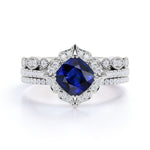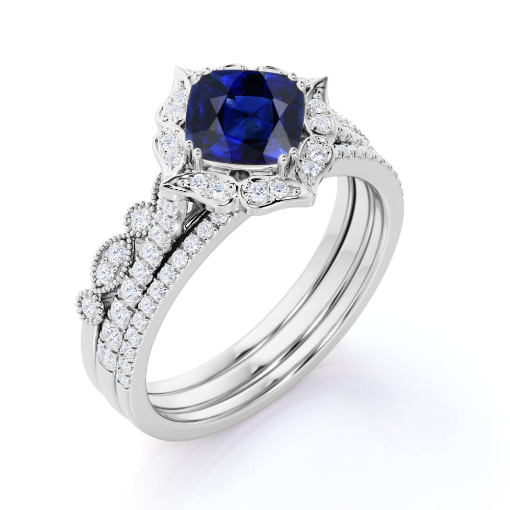 An elegant 2 Carat Cushion Cut Lab-Created Sapphire and Diamond Halo Trio Wedding Set with 2 Art Deco Bands in White Gold. This ring features a 1 carat Cushion cut Lab-Created Sapphire surrounding with 1 carat smaller white diamonds, for a total weight of 2 carats. The floral cluster styled trio wedding set is made with Lab-Created sapphire, real diamonds and on real gold. This Lab-Created sapphire trio wedding set can be made in either Rose, White, Black or Yellow Gold, and can be customized to your choice of 10k, 14k solid gold or 18k Gold over Silver. As always, the order comes with jewelry certificate, 6 month limited warranty and 30 days full refund policy. Although each ring is handmade and customized to your specifications, we guarantee that once you placed your order, we will make and deliver it to you within 2weeks.