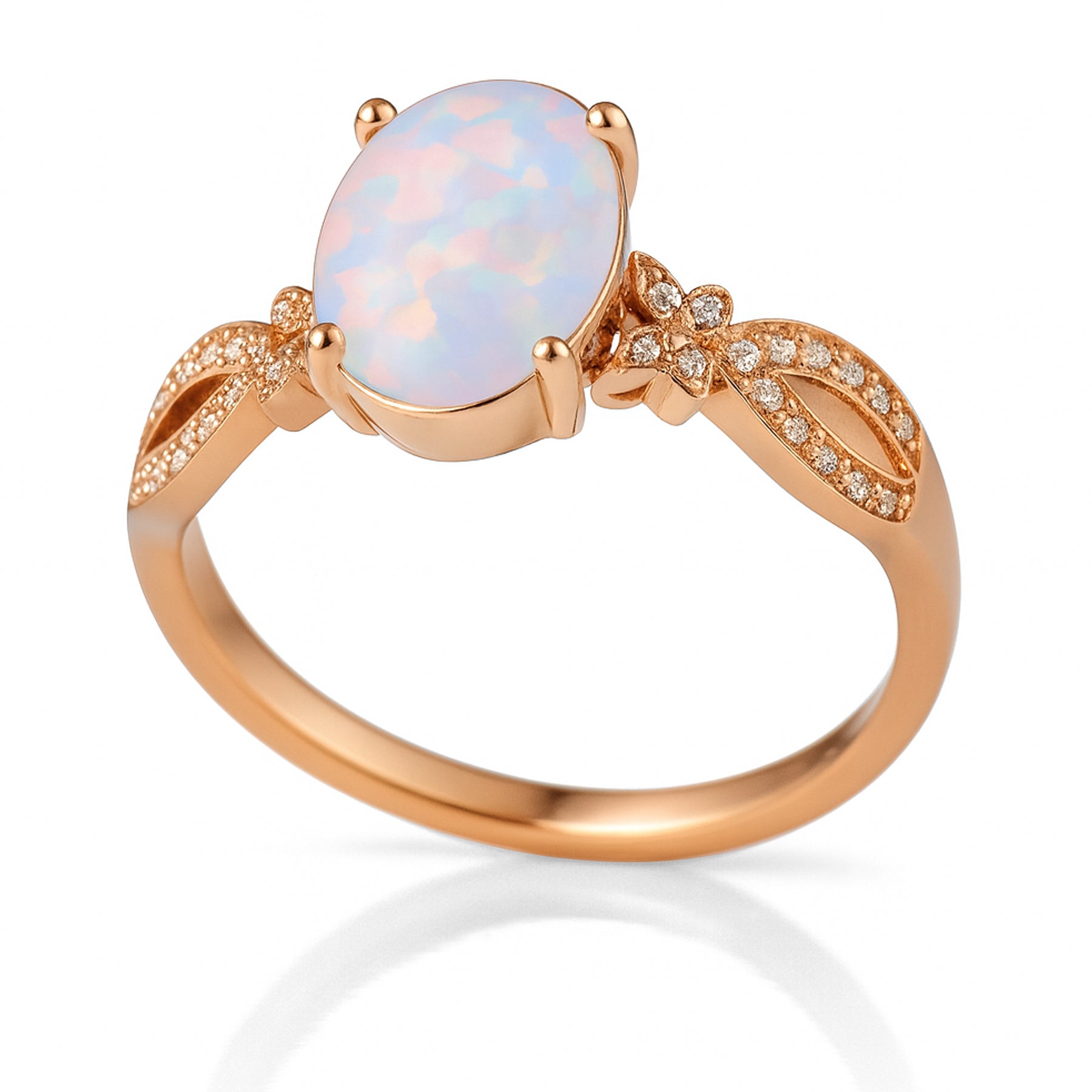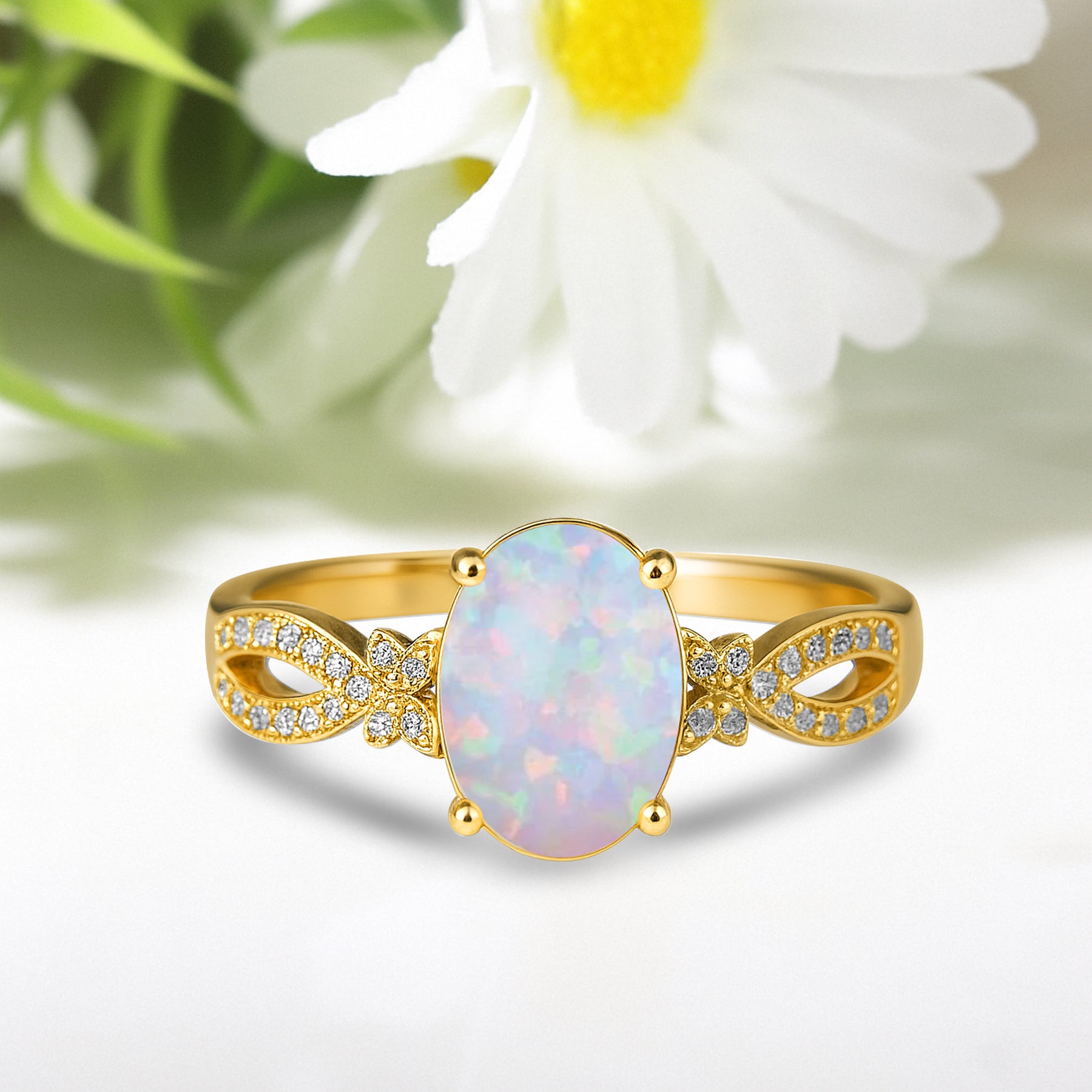 This stunning design features a total carat weight of 1.35 Ct, beautifully crafted for brides who adore unique, radiant color. At the center rests a 1 carat oval cut lab Lab Created Opal, glowing with warm, fiery hues that symbolize passion and love. The side stones, totaling 0.35 carats, will be Moissanite for silver plated options and Diamond for solid gold, adding extra brilliance and sparkle to the design. With intricate milgrain and infinity detailing, this engagement ring is a captivating blend of elegance, symbolism, and modern artistry.