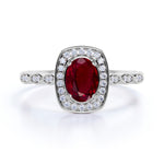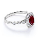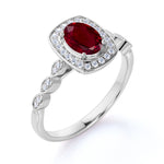 Perfect for any occasion, birthday gift, anniversary gift, promise ring or just a simple gift for your loved ones. This Lab Ruby ring is also considered the new vintage art deco engagement ring, because of its art deco style that is unique and one of a kind ring design. This Lab Ruby ring features an approximately 1.50 carat oval cut certified Lab Ruby, surrounded by .50 carat authentic side diamonds, for a total weight of 2 carats.