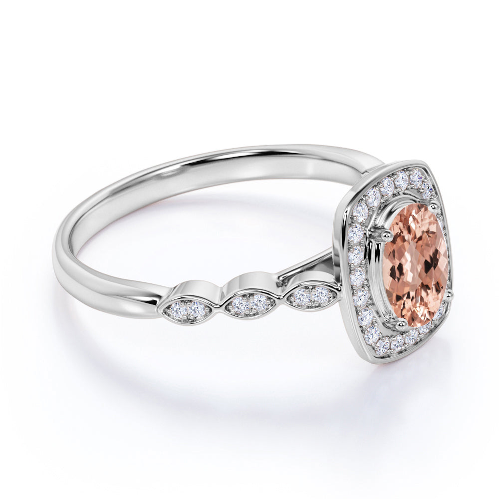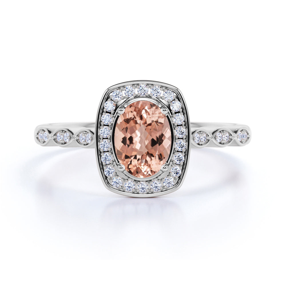 Large 1.50 Carat Elliptical Shape Dark Salmon Morganite and Diamond Art Deco Engagement Ring in White Gold
