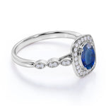 The wait is over for those women who are tired of those crazy details which is not necessary for your engagement ring, this minimal blue Lab-Created sapphire ring is the best for you. This affordable blue Lab-Created sapphire ring is the best for you, not just by the look but the price and quality as well. This blue sapphire ring features an approximately 1 carat oval cut certified blue Lab-Created sapphire, surrounded by .50 carat authentic side diamonds, for a total weight of 1.50 carats.