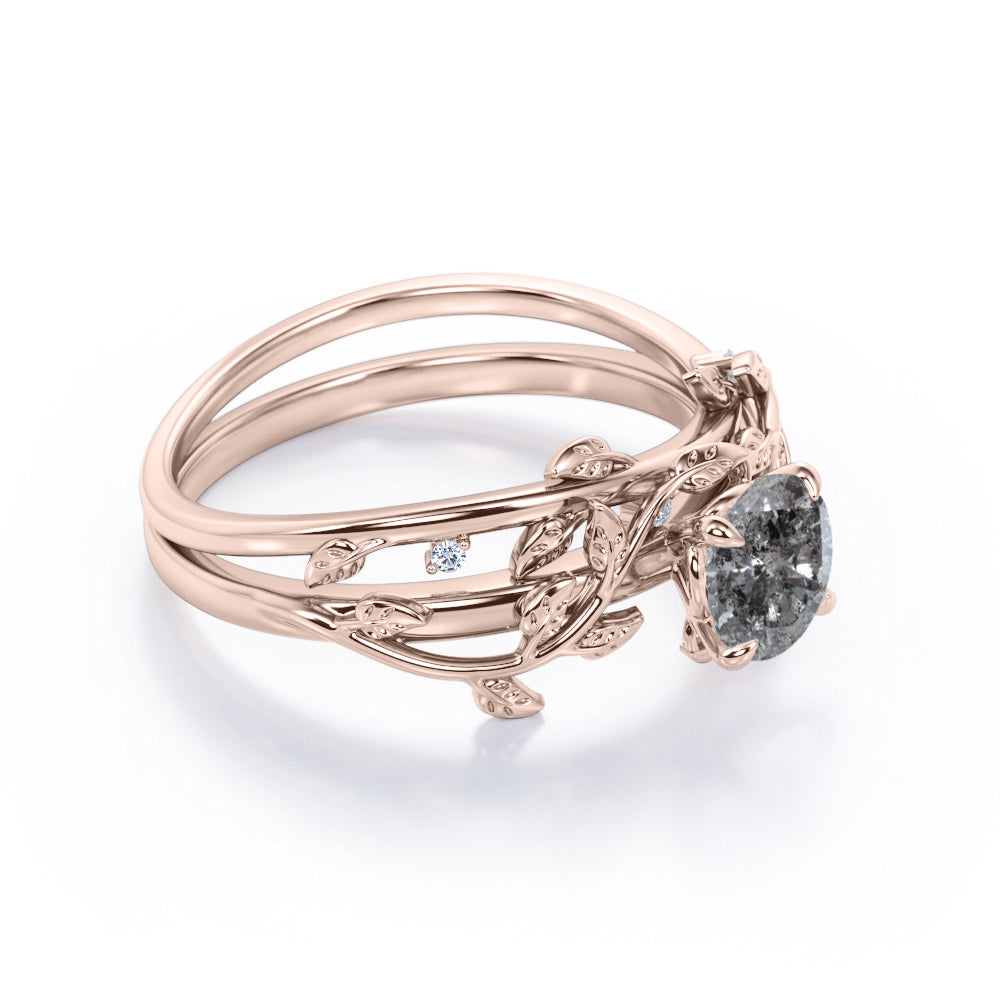 Leaf and Vine 0.50 Carat Round Cut Natural Salt and Pepper Diamond Nature Inspired Band Wedding Ring Set in 18k Rose Gold over Silver