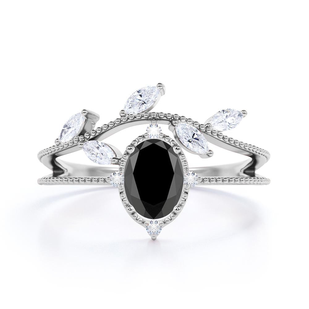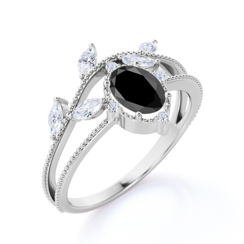 Leaf Design 1.45 Carat Oval Lab Black Diamond and Vintage Split Shank Engagement Ring in White Gold