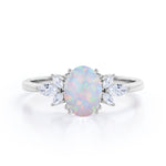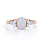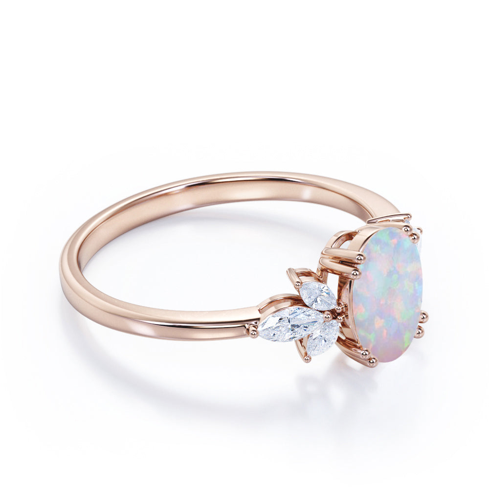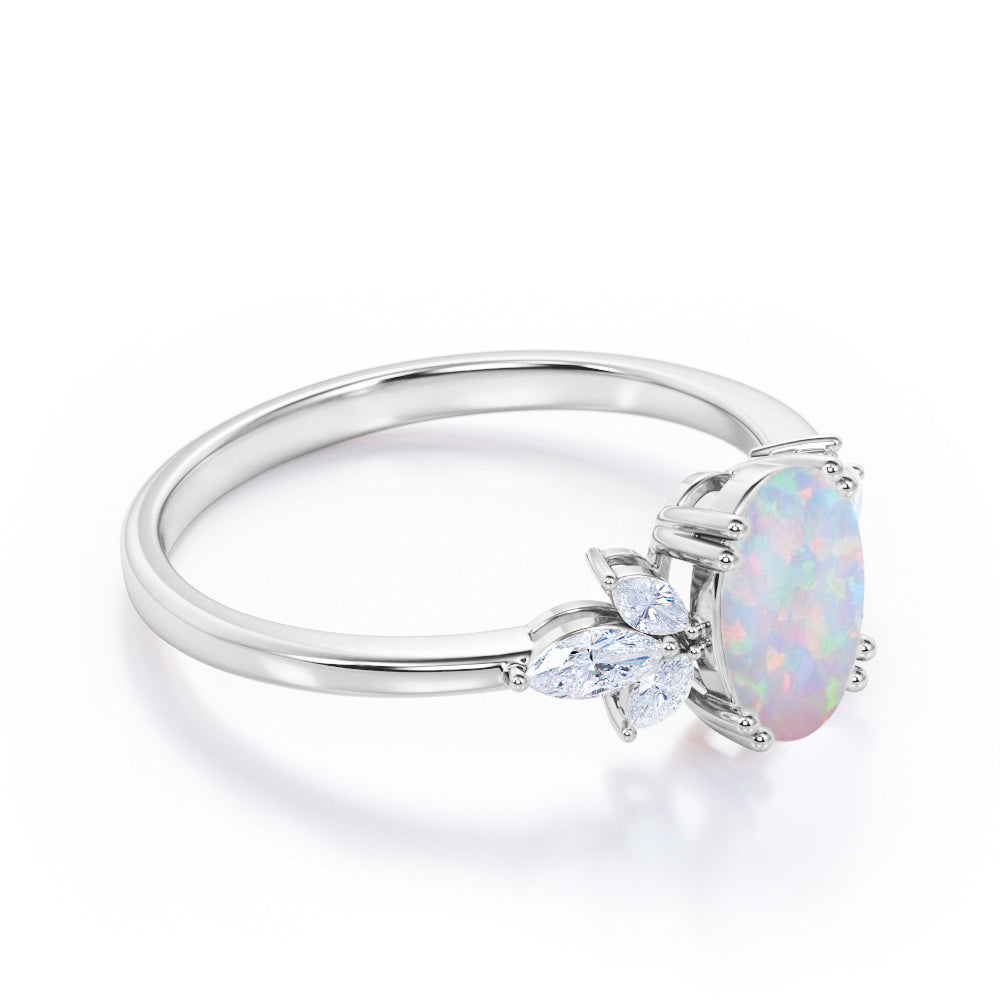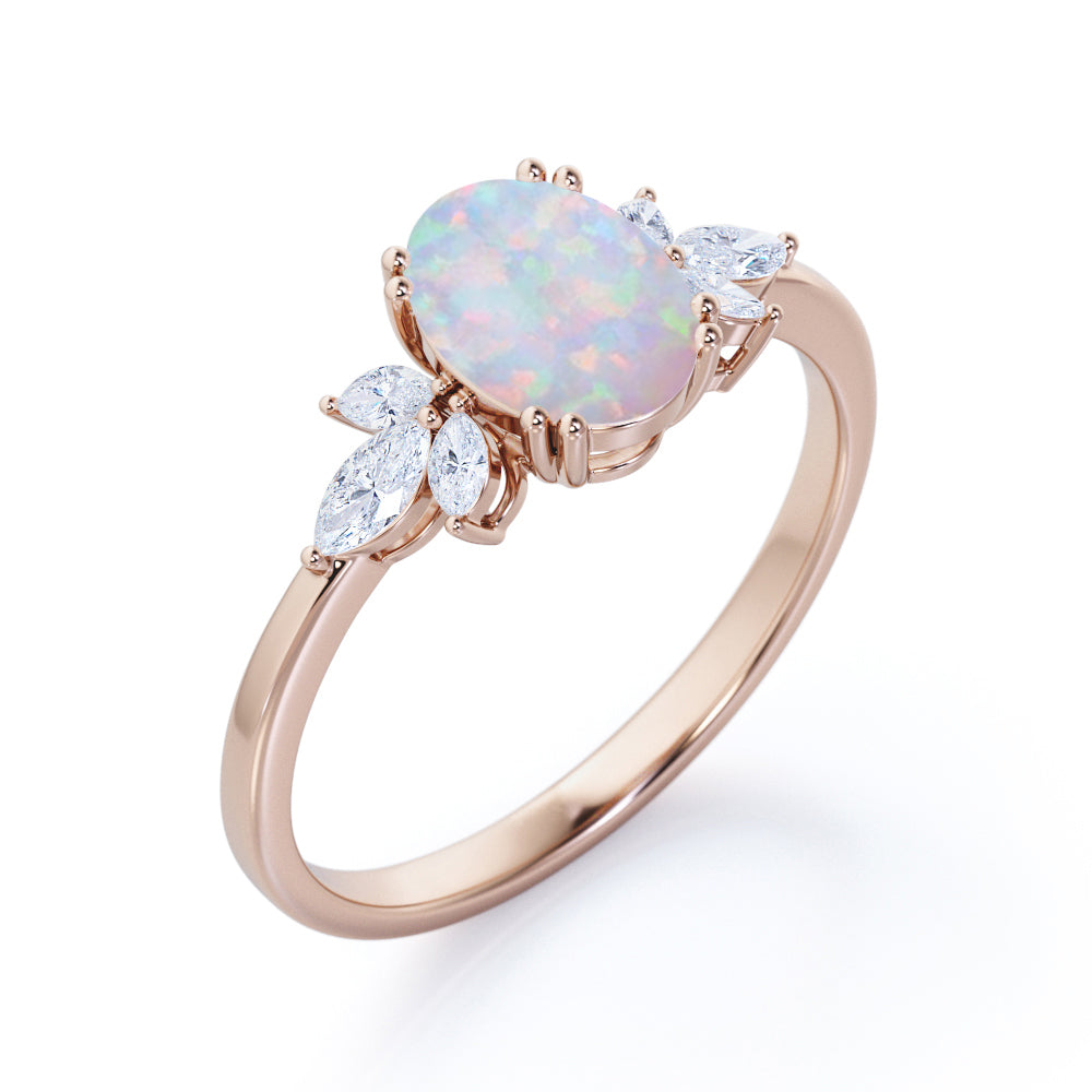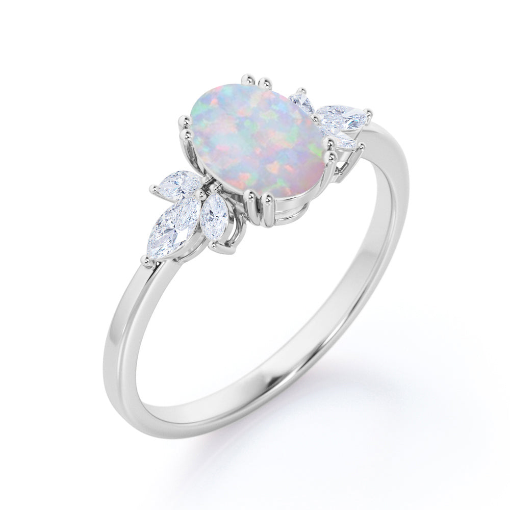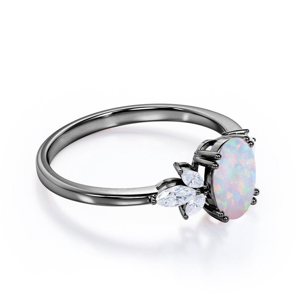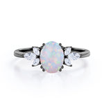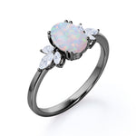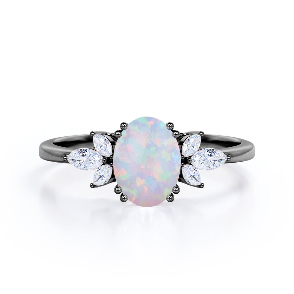 Leaf Design Eight Prongs 1.40 Carat Oval Cut Precious Fire Opal And Cubic Seven Stone Engagement Ring In Black Gold. This one is for the bold bride seeking something unconventional. If you are an outside-the-box kind of person, then our exquisite genuine opal and diamond engagement ring is a great choice. Set in a cluster of smaller diamonds, this oval cut opal stone radiates colorful jewel tones. This seven stone engagement ring features six marquise cut diamonds precisely cut to frame the seventh oval cut opal center stone. Handmade with utmost love and care by our devoted artisans, this leaf design ring will definitely complement you in any ensemble. This leaf design eight prongs 1.40 carat oval cut precious fire opal and diamond seven stone engagement ring in black gold can also be customized to 18k Gold plating over silver, 10k Gold or 14k Gold as you prefer. Think no more, just grab this offer now. Please note that the side stones are cubic zirconia stones.
