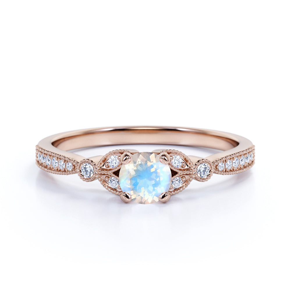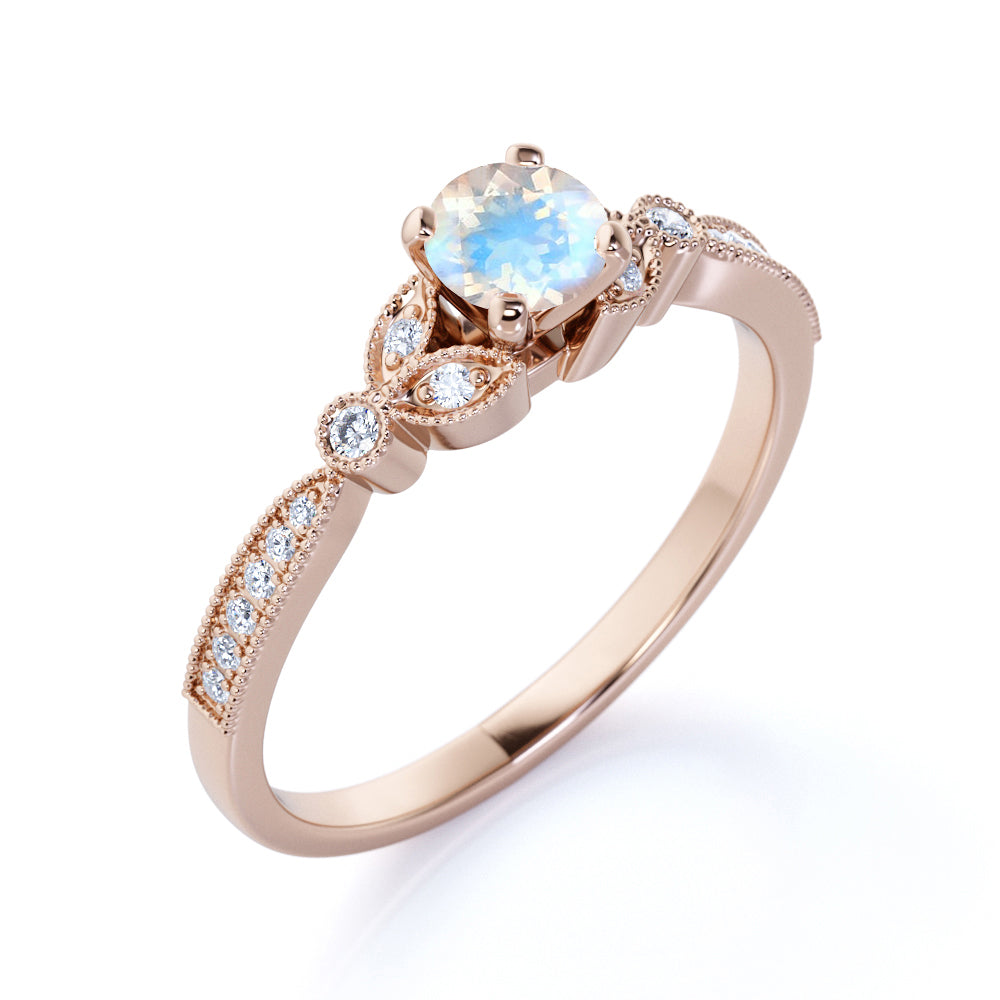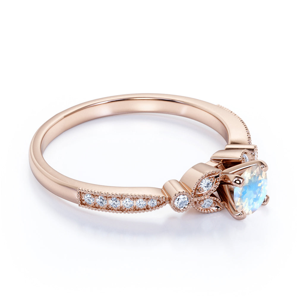 Leaves 1 Carat Round Mystic Moonstone and Diamond Modern Art Deco Engagement Ring in Rose Gold