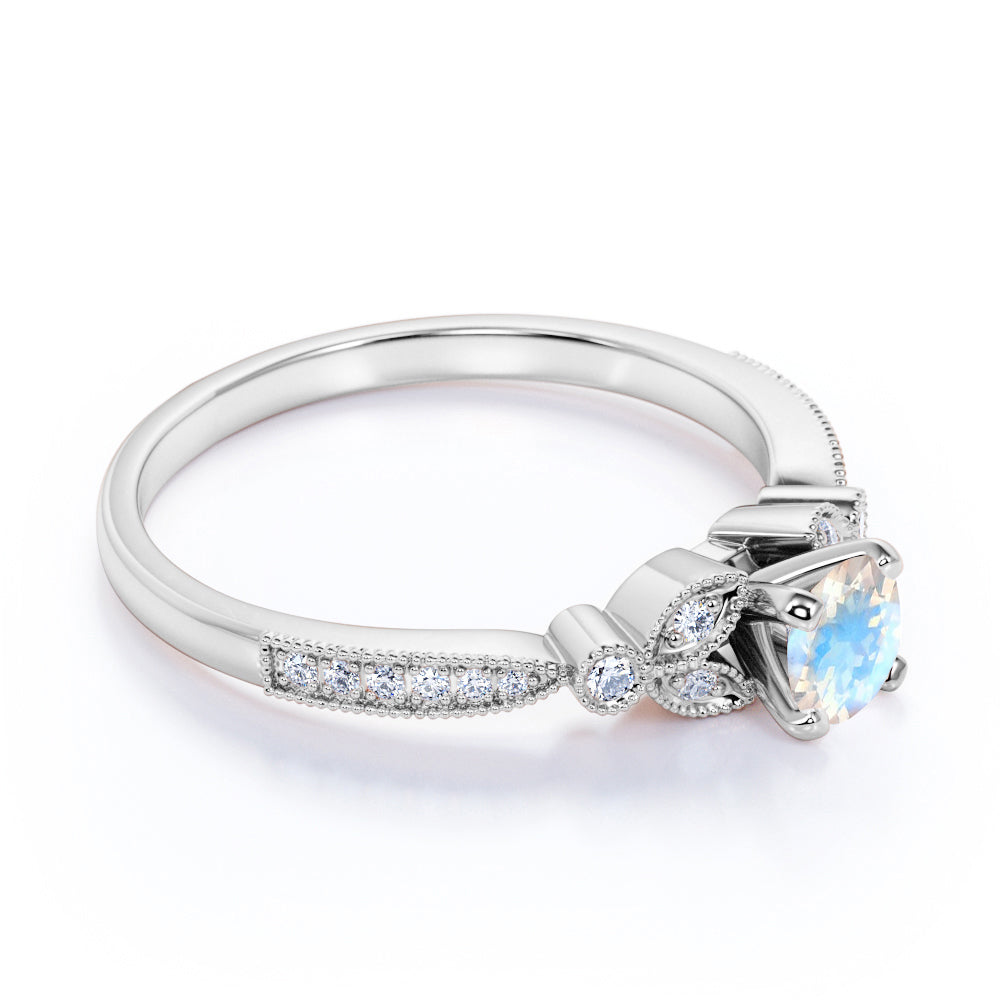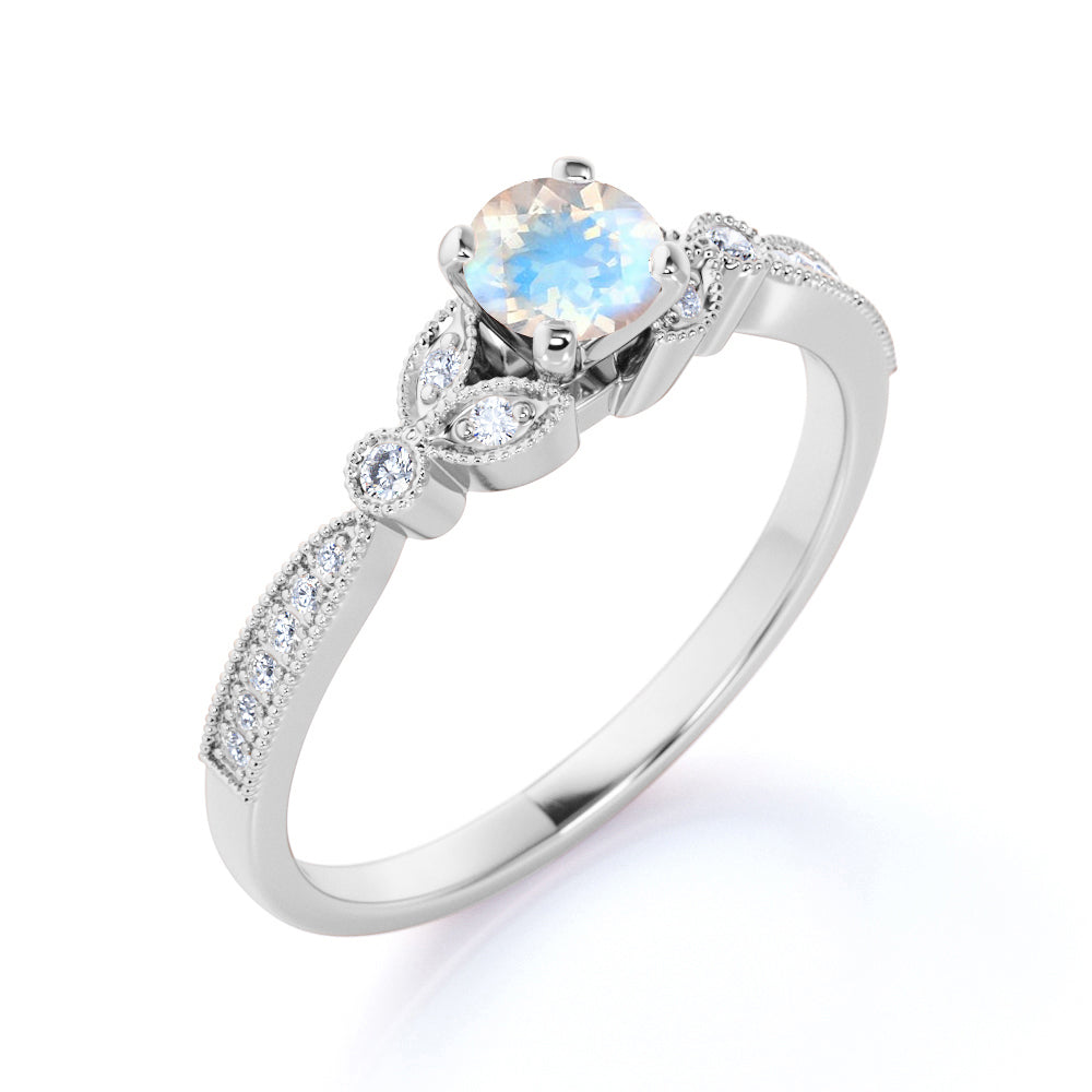 This petite moonstone ring is very cool and comfortable, it is also great for daily wear or even a proposal ring for her. This moonstone is best for engagement ring or proposal ring. The vibrant color of this ring brings life to the fullest. This moonstone ring features an approximately .75 carat round cut authentic moonstone, surrounded by .25 carat natural side diamonds for gold ring and moissanite for silver ring, for a total weight of 1 carats.