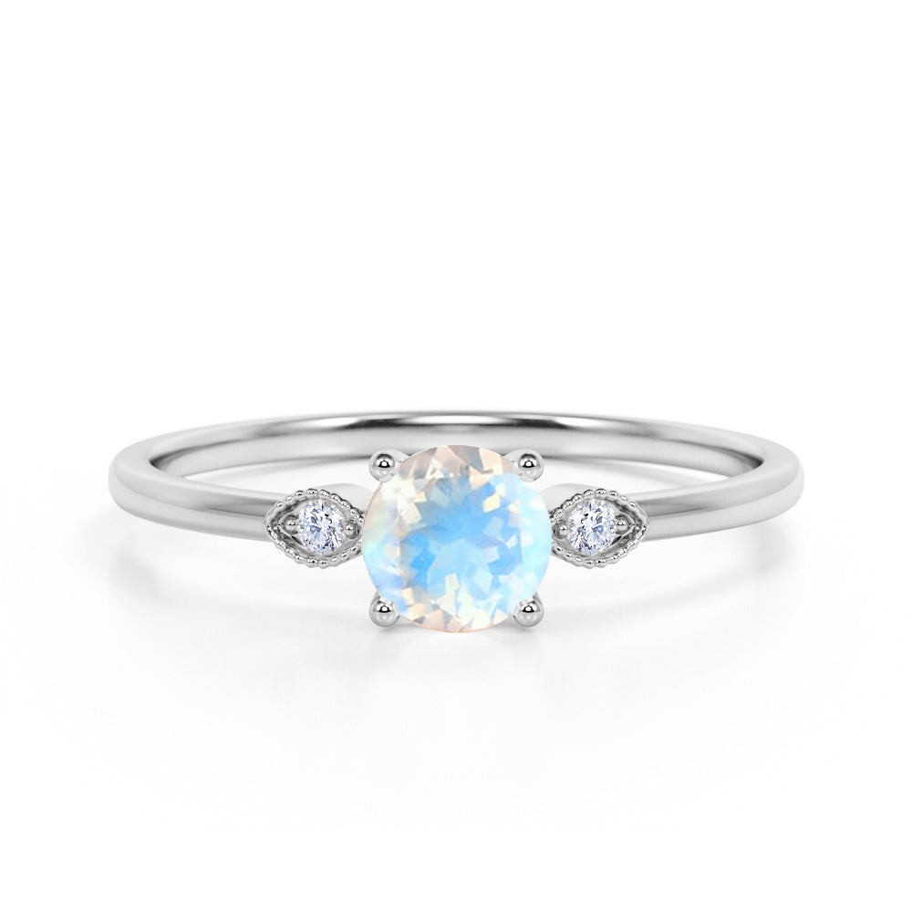 Limited Time Sale 1.35 Carat Round Shape Rainbow Moonstone and 3 Stone Diamond Vintage Engagement Ring in White Gold