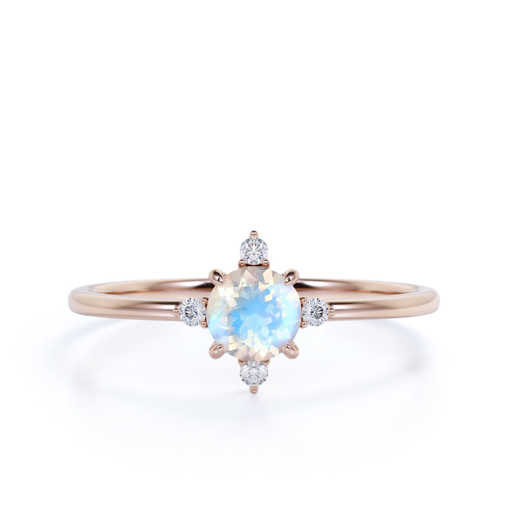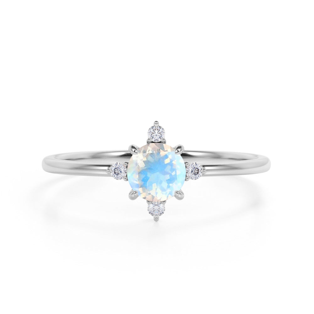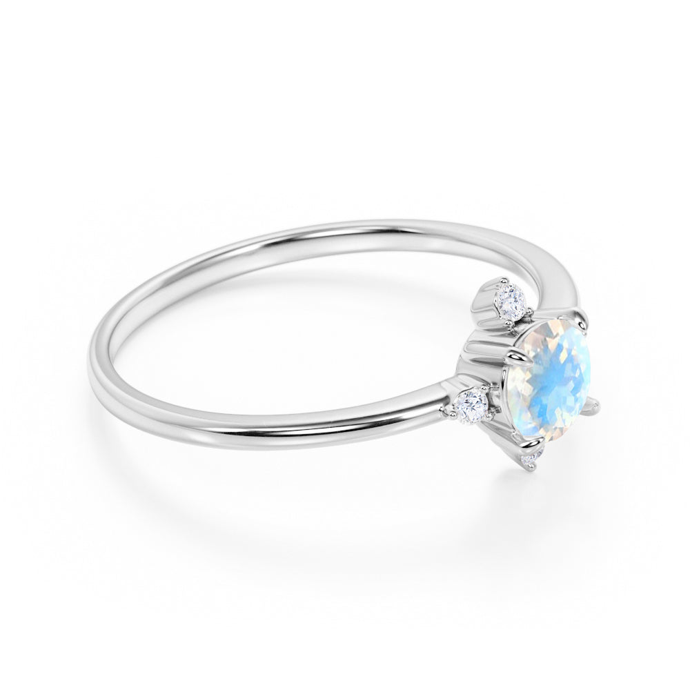 Limited Time Sale 1.45 Carat Round Cut Rainbow Moonstone and 5 Stone Diamond Vintage Engagement Ring in White Gold