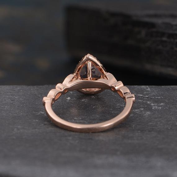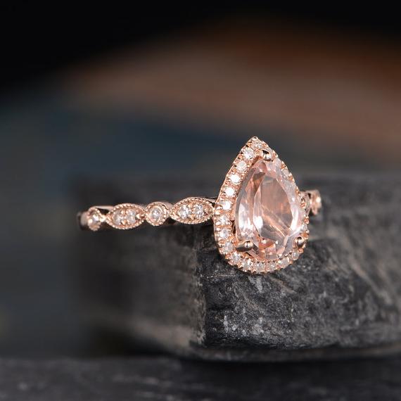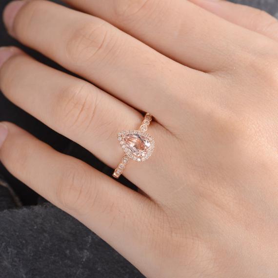 Limited Time Sale: ArtDeco with Milgrain 1.25 Carat Pear cut Morganite and Diamond Engagement Ring in Rose Gold. The ring is made with real Morganite and on real solid 10k Gold.