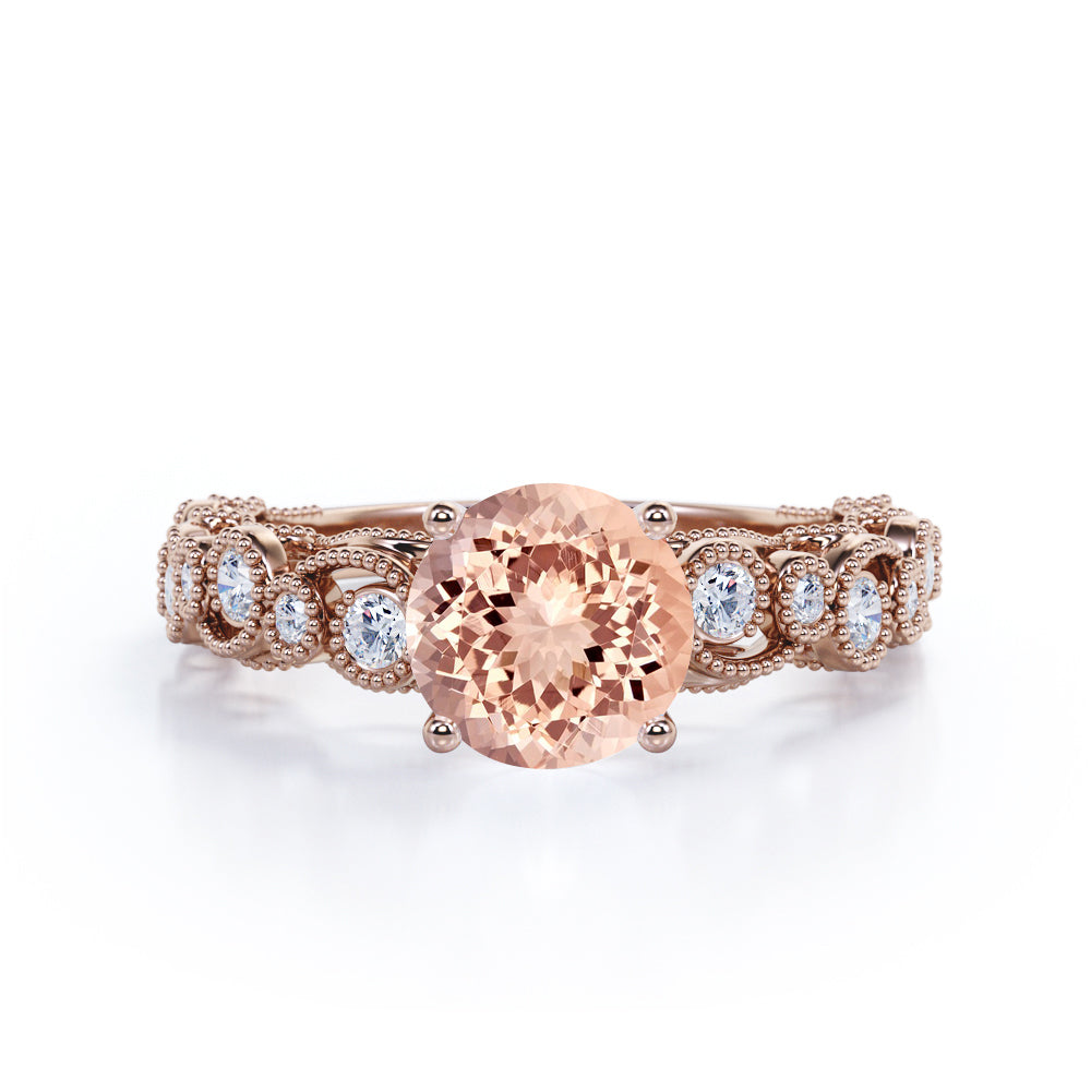 - The Morganite and Diamond Trilogy Three Stone Engagement Ring can be made in either 10k, 14k, or 18k real solid gold and in any color between Rose, White or Yellow.