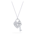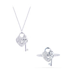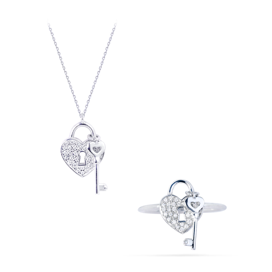 Create a magical moment with this Lock & Key Jewelry Gift Set of 0.20 TCW Heart Cluster Moissanite with Ring & Pendant. Skillfully hand-cut into a nice round cut by our skilled jewelers, this affordable bridal jewelry set integrates total 0.20 carat moissanites on solid white gold plating over silver. Special and non-traditional, this silver jewelry set is well-suited for those who are not quite into normal lifestyle. With naked eyes moissanites look, shine and feel exactly like diamonds. Reflective properties of this valentines jewelry set will unquestionably be an essential additional to any jewelry collection. This women's jewelry set is beautiful and accessible since it is available at an affordable price. Moissanites are the most popular alternative gemstone for diamonds while being at lower and more affordable price. Considered as a symbol of timeless love and affection for your lover, this valentine's day jewelry set for her can be a perfect gift for any occasion like engagements, Valentine's day, mother's day or anniversary. In regards to its hardness, moissanite is almost as hard as diamond which means that it is notably durable. Let's fulfill your love story with this silver jewelry set, and she will be eternally joyful.