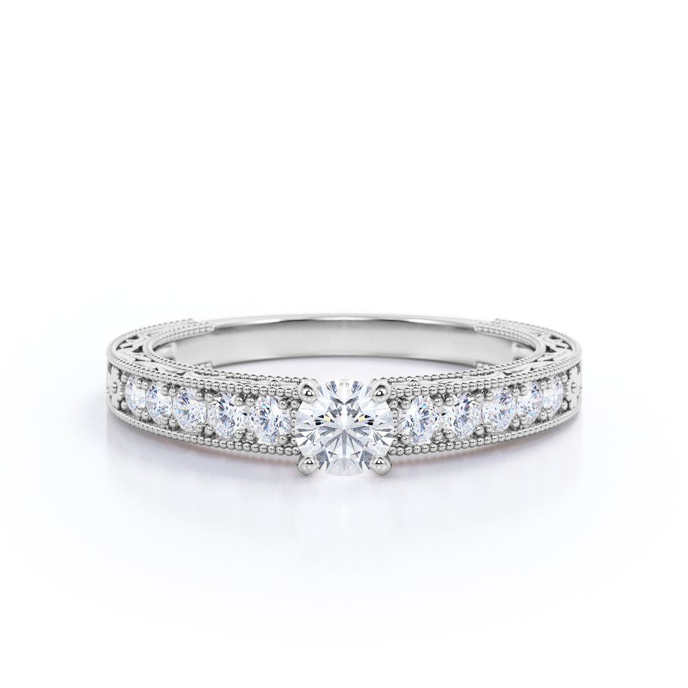 Bring a beautiful garden to your hand with the Lovely Dainty Flower 0.6 carat Round Moissanite and Diamond Engagement Ring in White Gold. The promise ring features a 0.5 carat round Moissanite with more round Moissanite stones cascade down the band. Half of the ring is filled with an intricate nature-inspired filigree; it is engraved into floating leaves and flowers. This Moissanite ring is edged by Milgrain decor so it is one of the perfect choices if you would like to buy a vintage engagement ring for your significant other. The ring is available at a very affordable prices and it comes with 3 metal options; 18k gold over silver, 10k gold, 14k gold with 4 color options; white gold, rose gold, yellow gold and black gold.