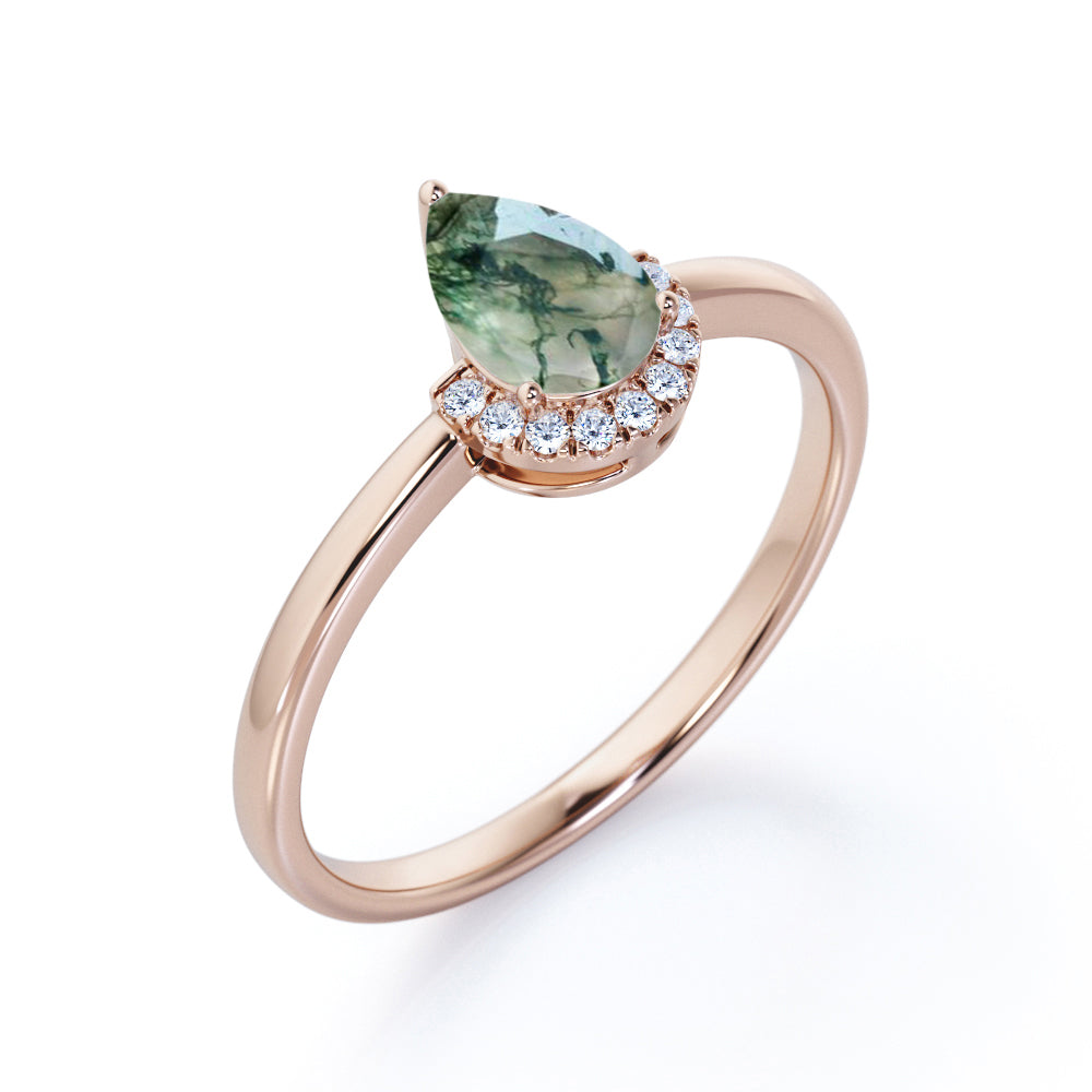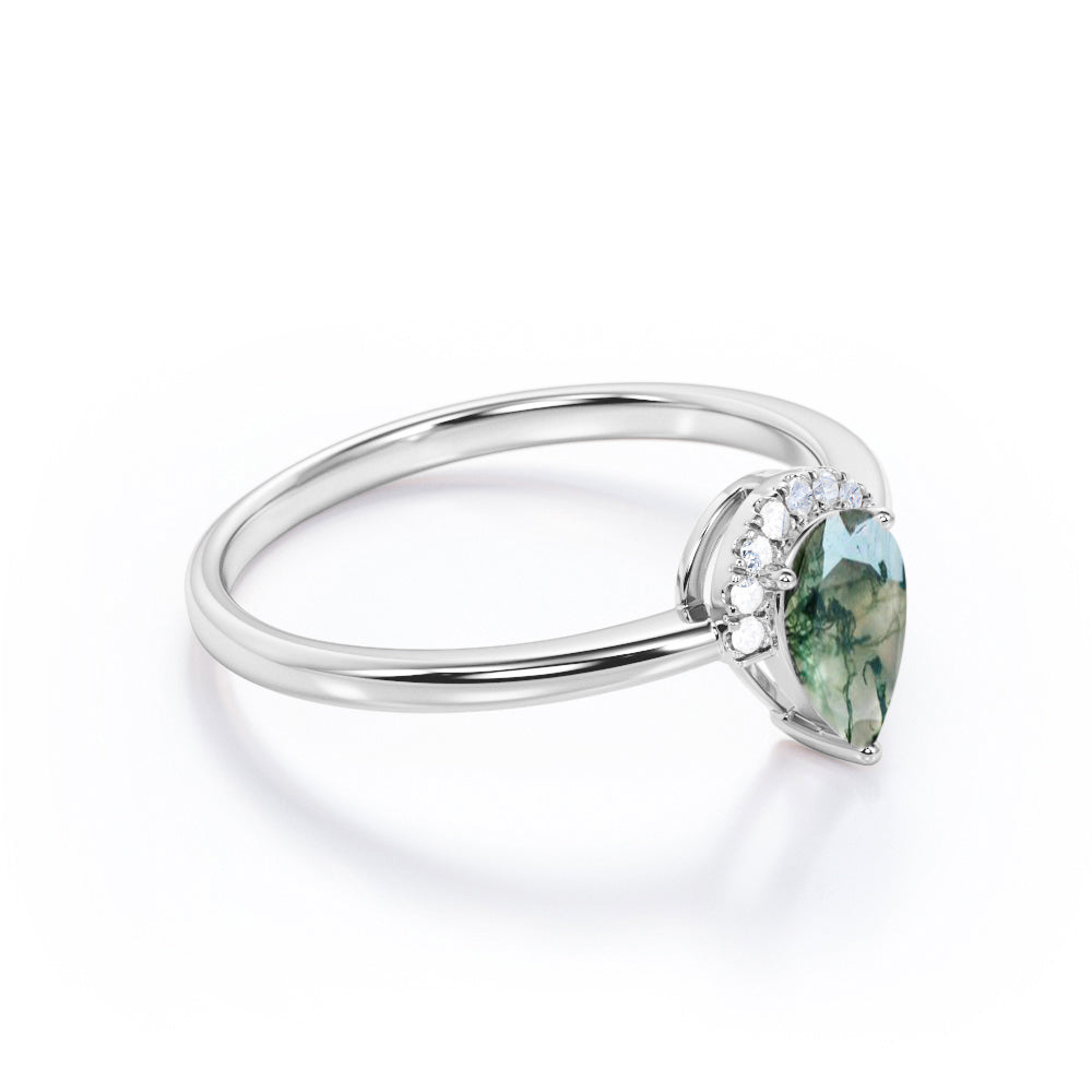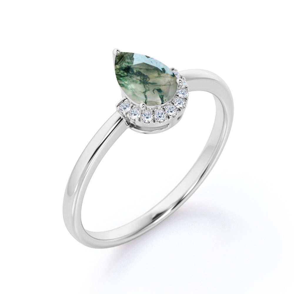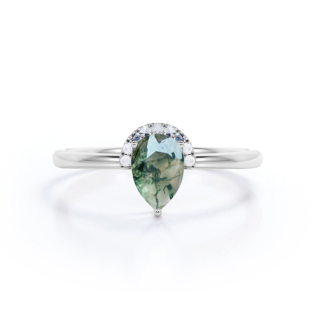 With its very quirky mossy inclusions, this Lovely Half Bezel 1.50 Carat Teardrop Shape Banded Moss Green Agate and Diamond Pave Minimalist Engagement Ring will perfectly fit your unique love story. This non traditional Agate ring features 1.25 carat pear cut real moss green agate and .25 carat real side diamond for gold ring and moissanite for silver ring. This unique engagement ring can be customized to either 10k, 14K and Gold over Silver and either Black Gold, Rose Gold, White Gold or Yellow Gold. Also, as your satisfaction is our most priority, we will do our best to have your handmade jewelry be carefully and beautifully crafted by our expert jewelers. The order also comes with a 30-day full refund policy. If you are looking for a very unique gift, this moss green Agate ring is perfect for you. It is well-known for spiritual and healing power. Encourage trust and hope with this real green Agate ring that shows a variety of white with green inclusions that resembles moss. Due to its unique milky white color with green dendritic inclusions, this vintage moss green Agate ring is sure to enchant its wearer. With its long history and many oral traditions around the world, this delicate druzy moss green Agate ring is sure to be eye-catching and bring all eyes on you. This ring is available at a very affordable price and available in both silver and gold ring. It perfectly fit those who are looking for a very unique ring that no two rings are alike. Being named a growth crystal, this real dendritic moss green Agate encourages spiritual growth and renewed commitment to a higher purpose. Those who has a penchant for vintage and flawless ring would completely fall in love with this ring. With its mesmerizing patters of colors and inclusions, this Agate ring will enchant your special someone with gracefulness.