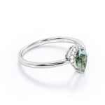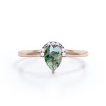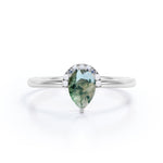 Lovely Half Bezel 1.50 Carat Teardrop Shape Banded Moss Green Agate and Diamond Pave Minimalist Engagement Ring