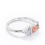 Three stone ring is a popular design where it normally features same cut of gemstone with bigger and smaller sizes but this Lovely House Three Stone 1 carat Baguette Morganite Engagement Ring in Rose Gold will take you to another level. The engagement ring displays a triangle cut and baguette cut Moissanite in bezel setting and a round cut of Moissanite in prong setting which are formed into a house shape in horizontal manner. The ring holds a total weight of 1 carat. If you are looking for a heart-warming gift for your special someone, this promise ring could be a perfect choice for you. It can be customized into your choice of 18k gold over silver, 10k gold or 14k gold with the color of white gold, rose gold, yellow gold and black gold.